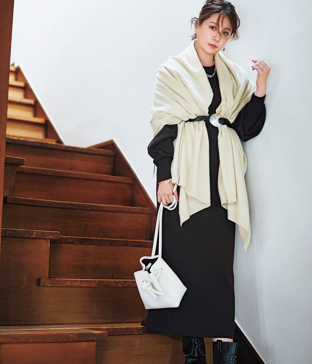ジレ風に着こなして洒落感をアップ。肩の丸みを活かせば、ドレープが優美な表情に。ニットワンピがぼやけないよう、ストールで構築的なフォルムを演出して。