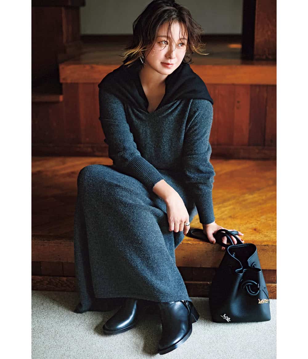 ストール¥14,300(シェアンド/ムーンバット)ワンピース¥49,500(LE PHIL/LE PHIL NEWoMan 新宿店)バッグ¥51,700(ヴァジック/ヴァジックジャパン)ブーツ¥79,200(PIPPICHIC/ベイジュ)ピアス¥30,800(ブランイリス/ブランイリス トーキョー)リング[右手]¥14,740(チビ・ジュエルズ/チビジュエルズ・ジャパン)リング[左手]¥19,470(バルブス/ズットホリック)