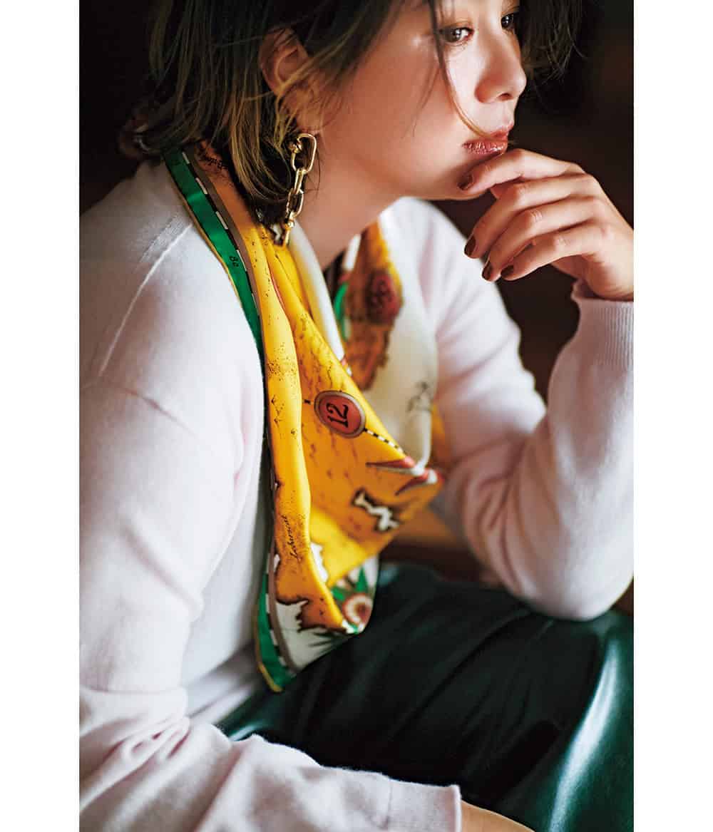 スカーフ¥22,000(マニプリ)ニット¥47,300(エブール/リトルリーグ インク)パンツ¥35,200(ゲミニー/ウィム ガゼット ルミネ新宿店)バッグ¥64,900(ジャンニ キアリーニ/ジャンニ キアリーニ 銀座店)パンプス¥35,200(ペリーコ サニー/アマン)ピアス¥22,000(バルブス/ズットホリック)バングル¥62,150(CHIRO JEWELRY/ロードス)