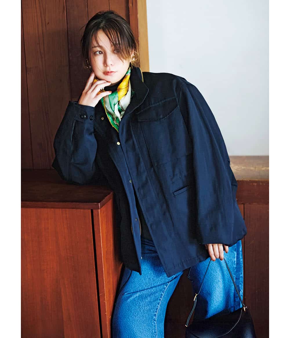 スカーフ¥22,000(マニプリ)ジャケット¥176,000(トゥモローランド ビー/トゥモローランド 渋谷本店)ニット¥27,500(トラディショナル ウェザーウェア/トラディショナル ウェザーウェア 渋谷店)デニムパンツ¥58,300(チノ/モールド)バッグ¥115,500(ワンドラー/ブルーベル・ジャパン)イヤーカフ¥20,900(Pearl for Life/ロードス)