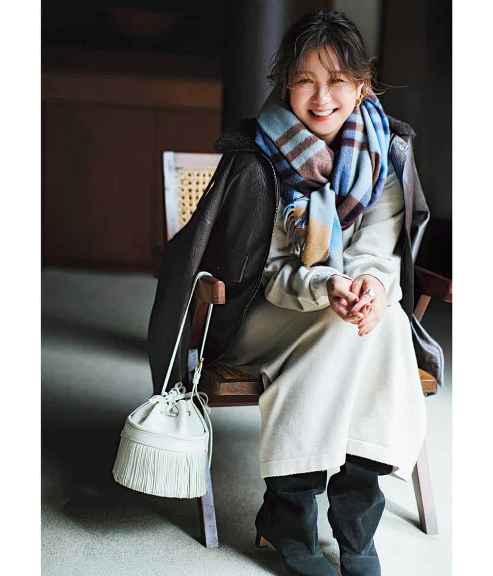 ストール¥41,800(アソース メレ/アイネックス)ニット¥16,500(ドレステリア/ドレステリア 渋谷スクランブルスクエア店)パンツ¥49,500(デパリエ/デパリエ 伊勢丹新宿店)バッグ¥17,380(セピカ/ジオン商事)イヤリング¥16,500(Jouete)リング[薬指]¥19,800〈KEIR.〉リング[人さし指]¥22,550〈AYAKA jewelry〉(ともにロードス)