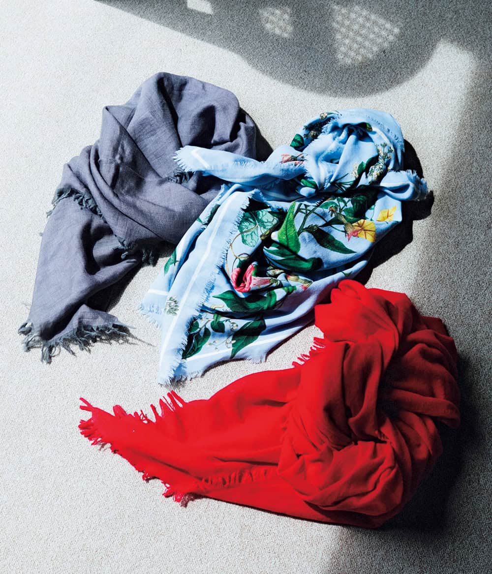 ストール 赤¥24,200(アソース メレ/アイネックス)花柄ストール¥49,500(セントピース/サードマガジン)ストール グレー¥19,800(フルラ/ムーンバット)