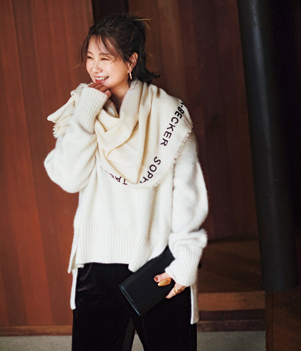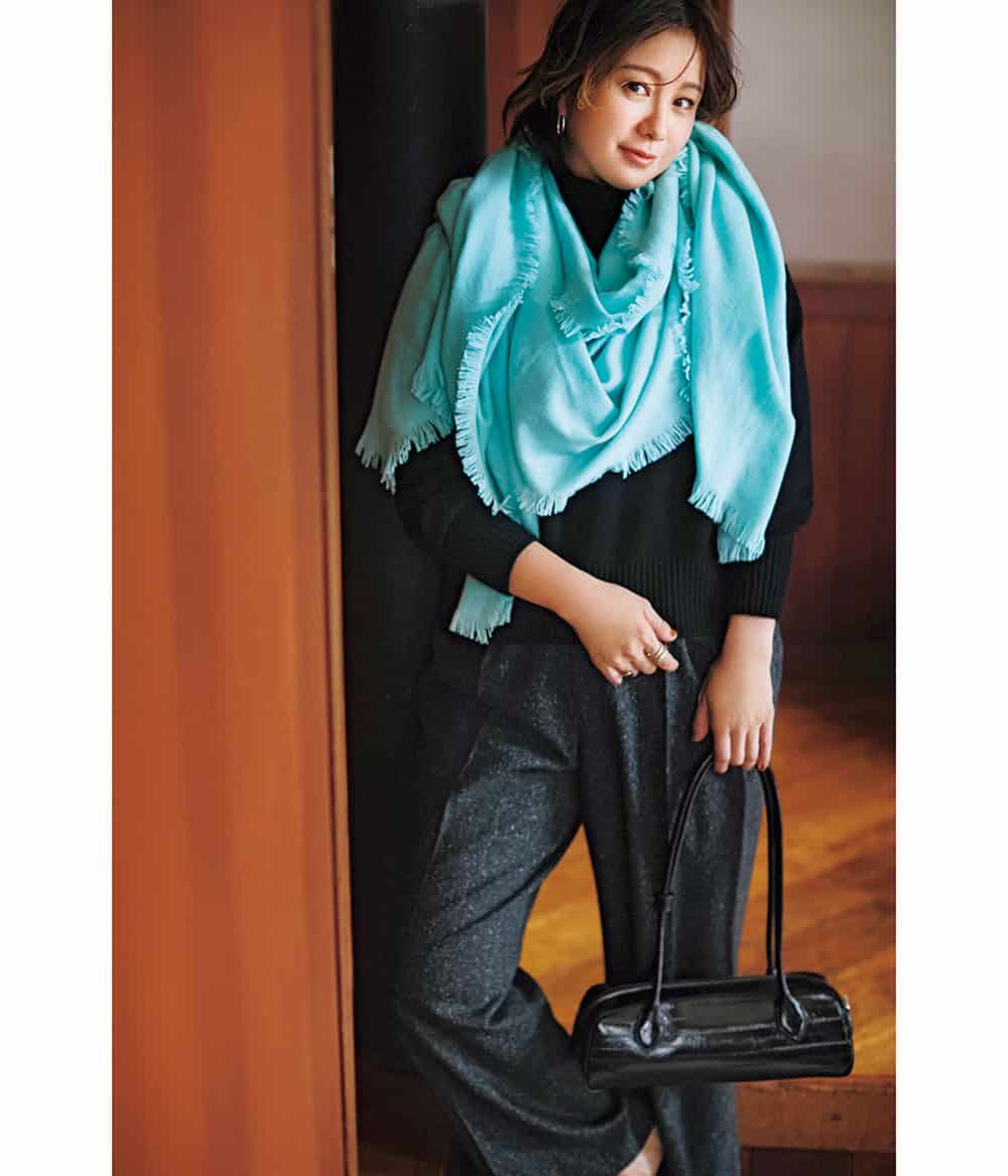ストール¥41,800(アソース メレ/アイネックス)ニット¥16,500(ドレステリア/ドレステリア 渋谷スクランブルスクエア店)パンツ¥49,500(デパリエ/デパリエ 伊勢丹新宿店)バッグ¥17,380(セピカ/ジオン商事)イヤリング¥16,500(Jouete)リング[薬指]¥19,800〈KEIR.〉リング[人さし指]¥22,550〈AYAKA jewelry〉(ともにロードス)