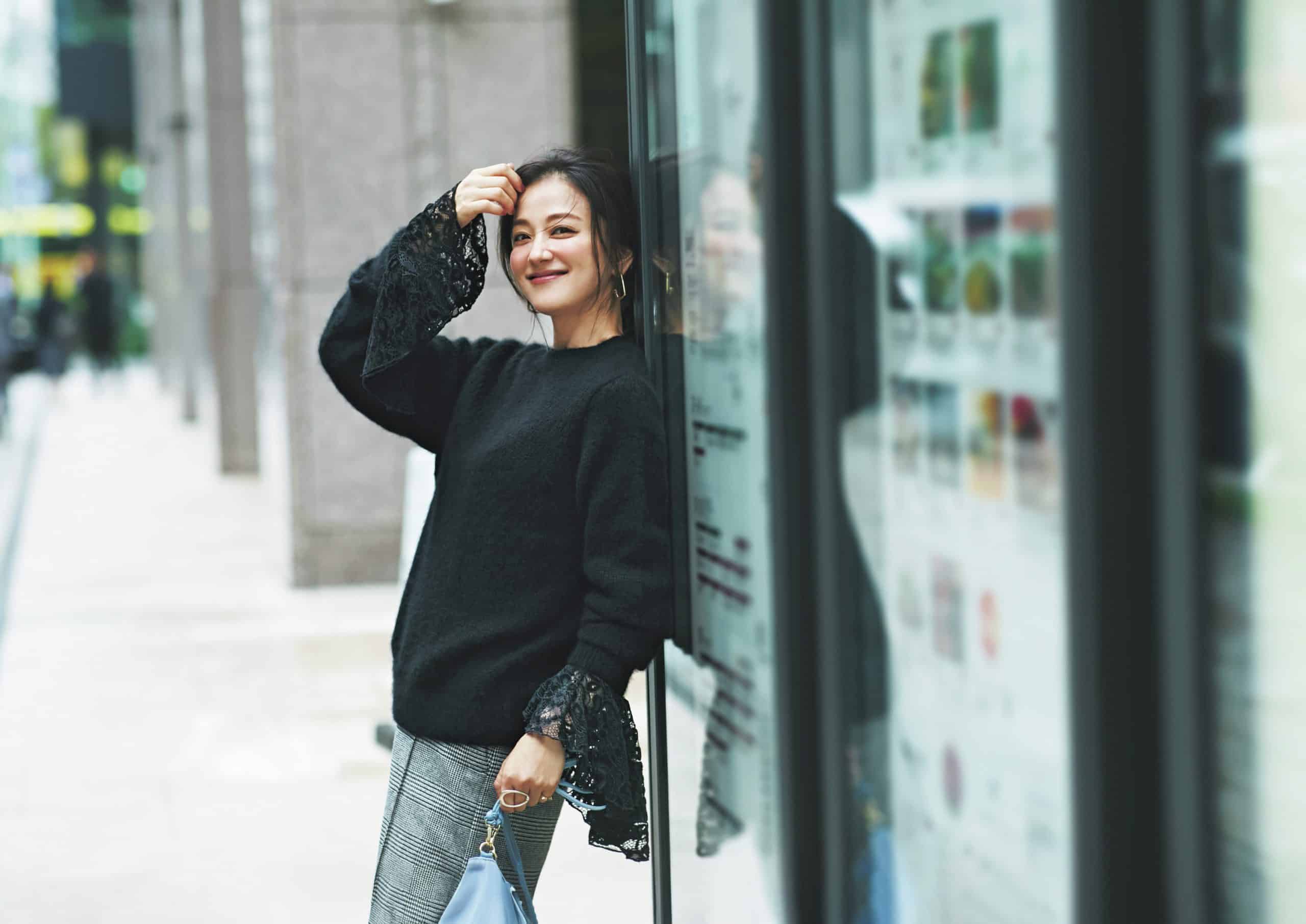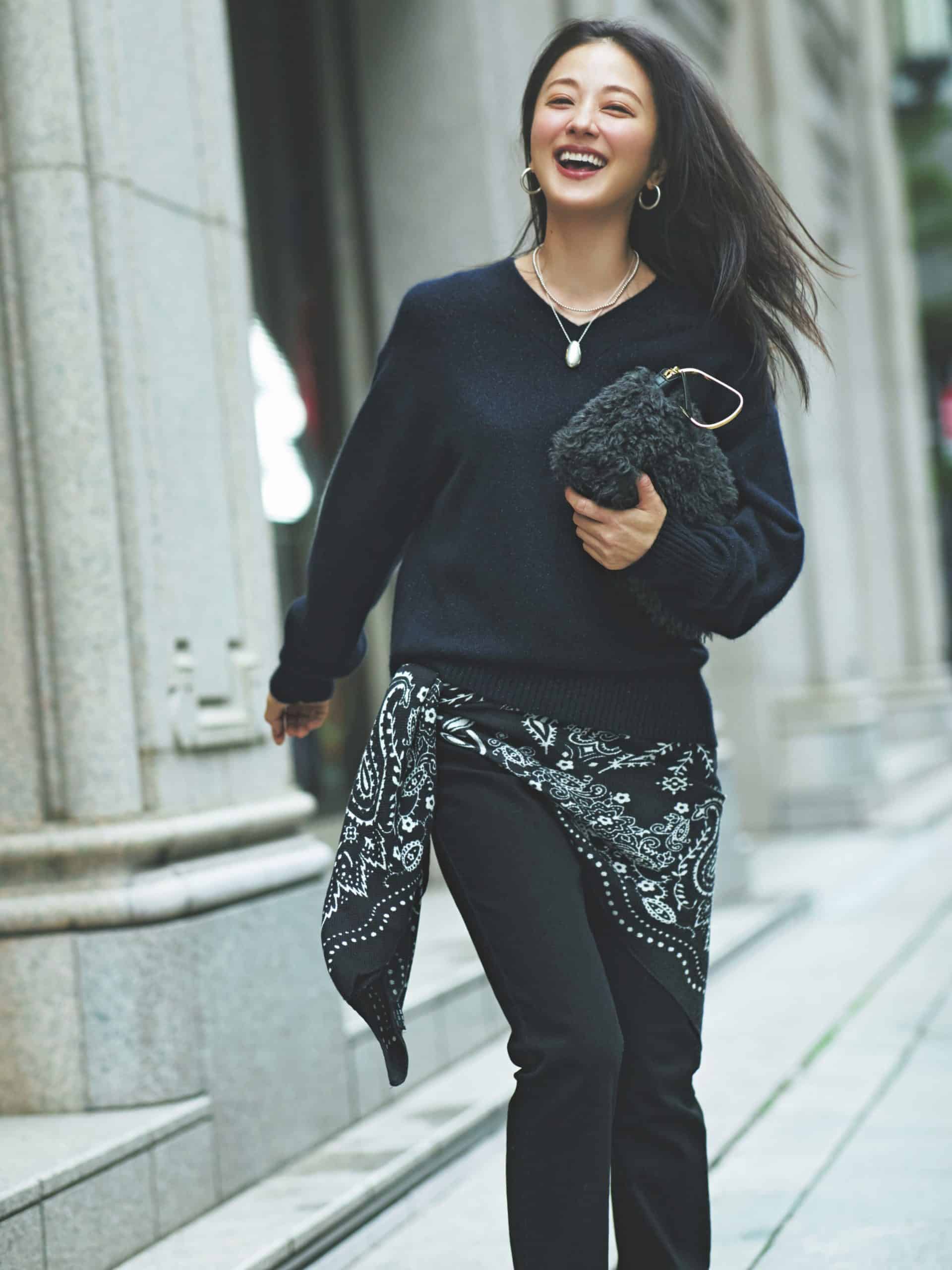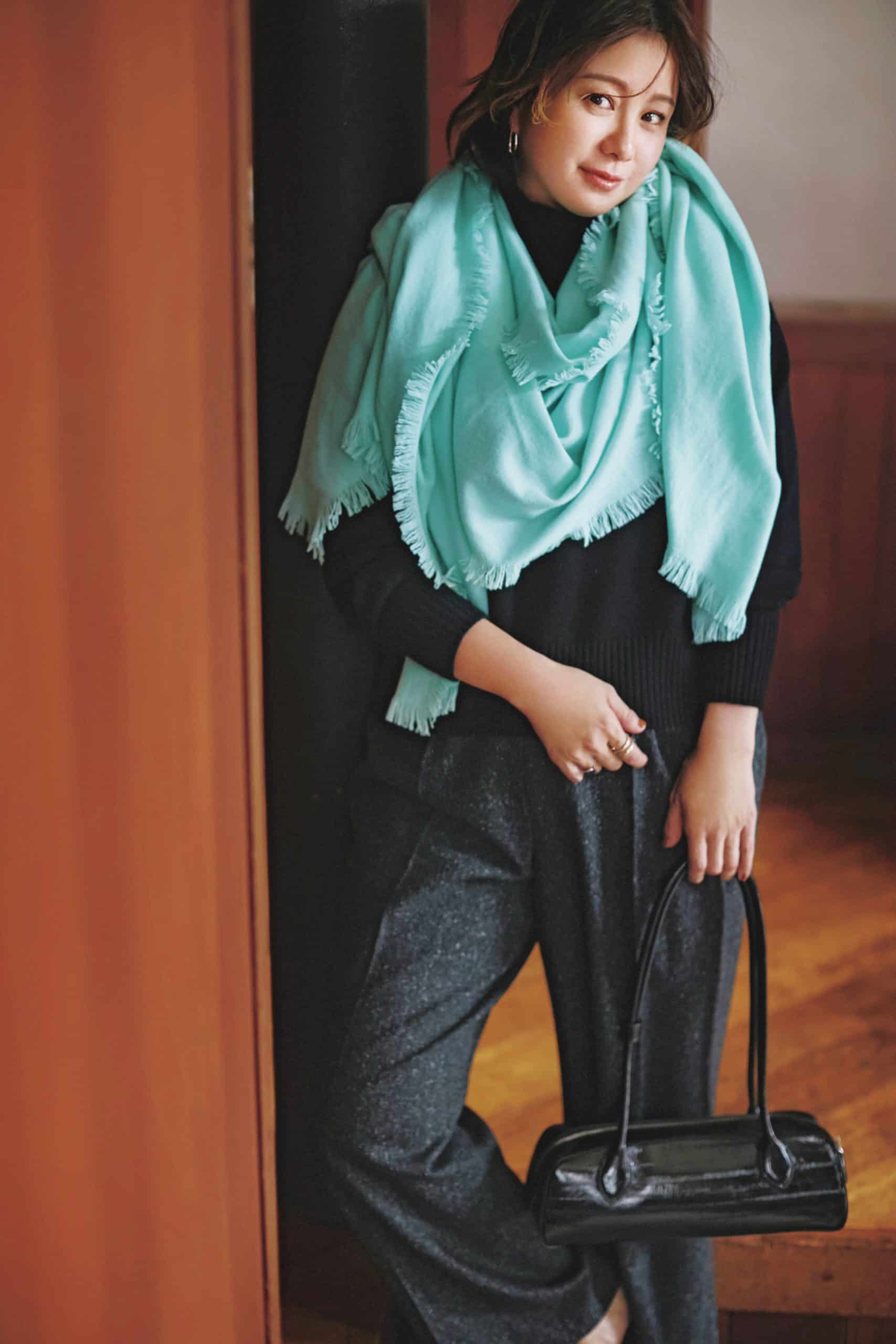 ストール¥41,800(アソース メレ/アイネックス)ニット¥16,500(ドレステリア/ドレステリア 渋谷スクランブルスクエア店)パンツ¥49,500(デパリエ/デパリエ 伊勢丹新宿店)バッグ¥17,380(セピカ/ジオン商事)イヤリング¥16,500(Jouete)リング[薬指]¥19,800〈KEIR.〉リング{hlb}[人さし指]¥22,550〈AYAKA jewelry〉(ともにロードス)
