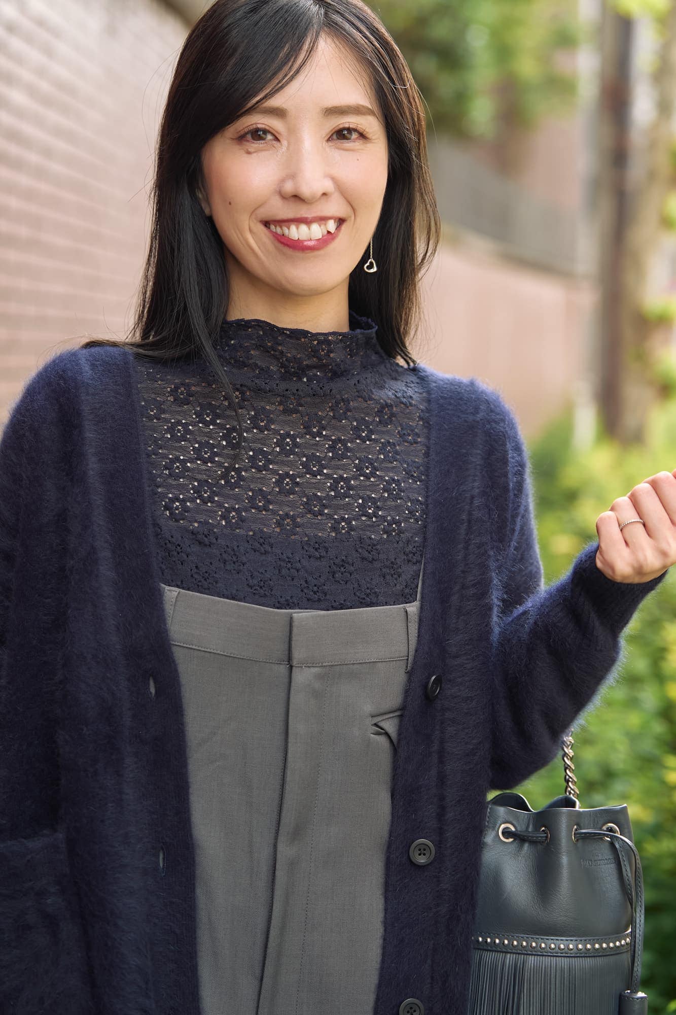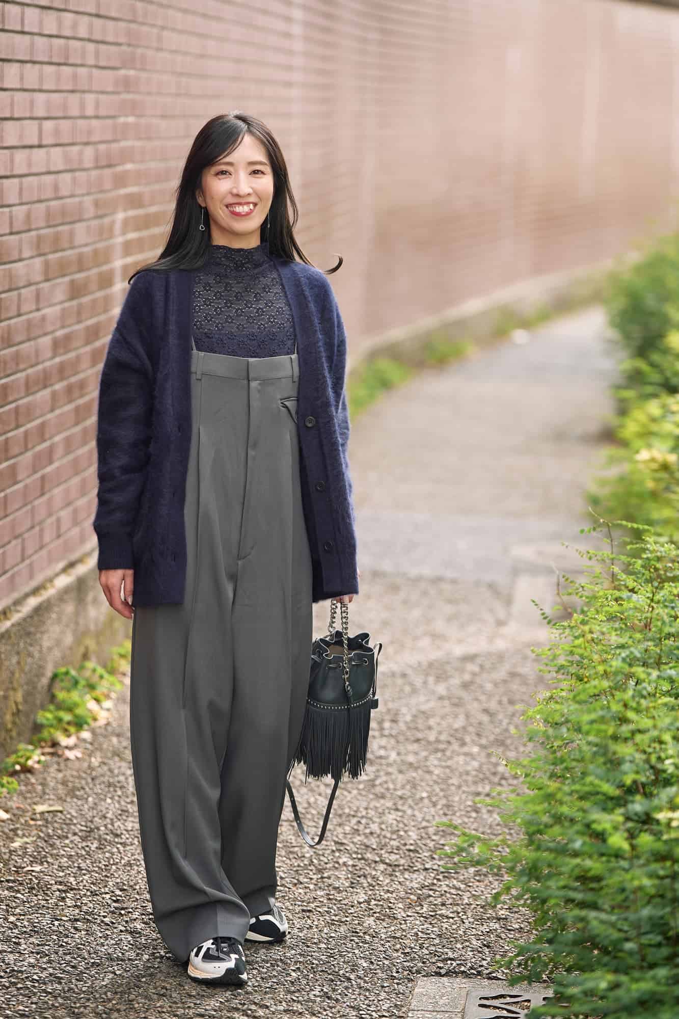 レーストップスはカジュアルスタイルに合わせたかったので、ドレッシーになりすぎないネイビーをチョイスしました。女性らしさや可愛さを足せるところがレースアイテムの良いところだと思います。厚手カーディガンのざっくり感と、レースの透け感という異なる素材感の組み合わせが絶妙で、この冬のお気に入りコーデになっています。