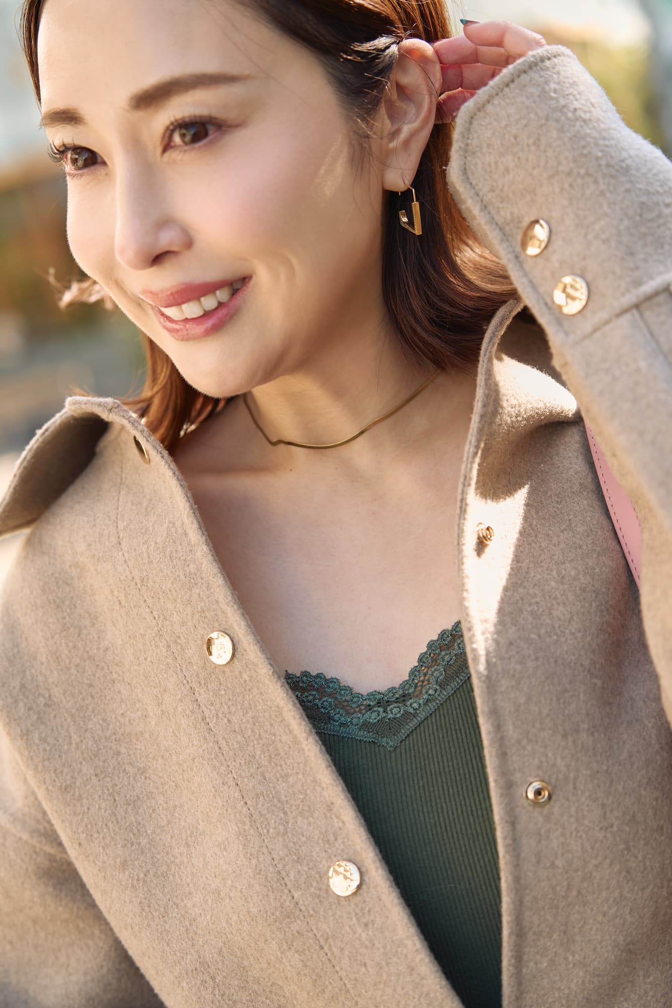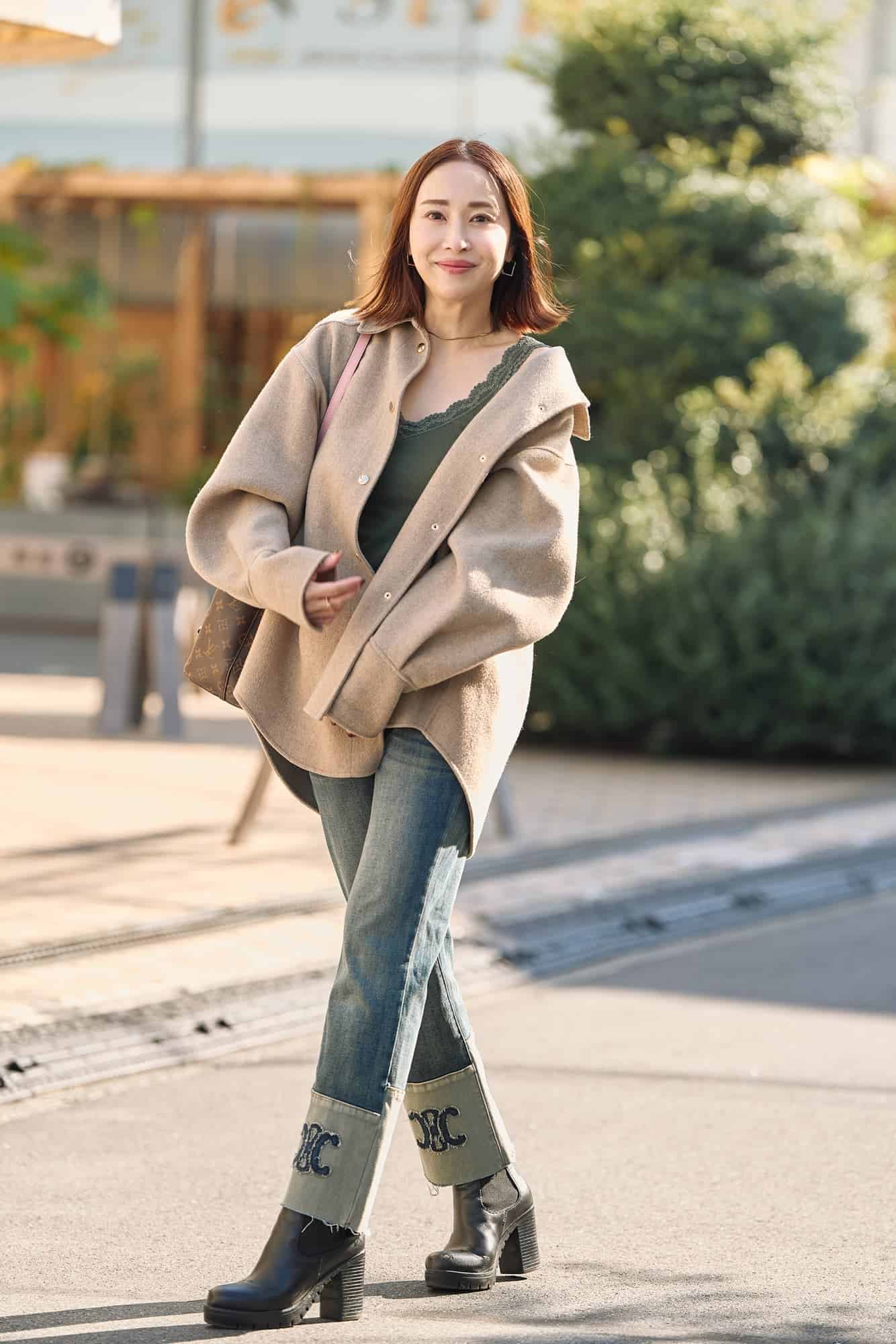 カーキのキャミソールは主張しすぎない首元のレースがお気に入り。自然に女性らしさをプラスしてくれます。そこにベージュのオーバージャケットをさらっと羽織って、レースを少し見せるだけで、頑張りすぎないのに今っぽいバランスに。シンプルなのにこなれて見える、大人カジュアルコーデです。