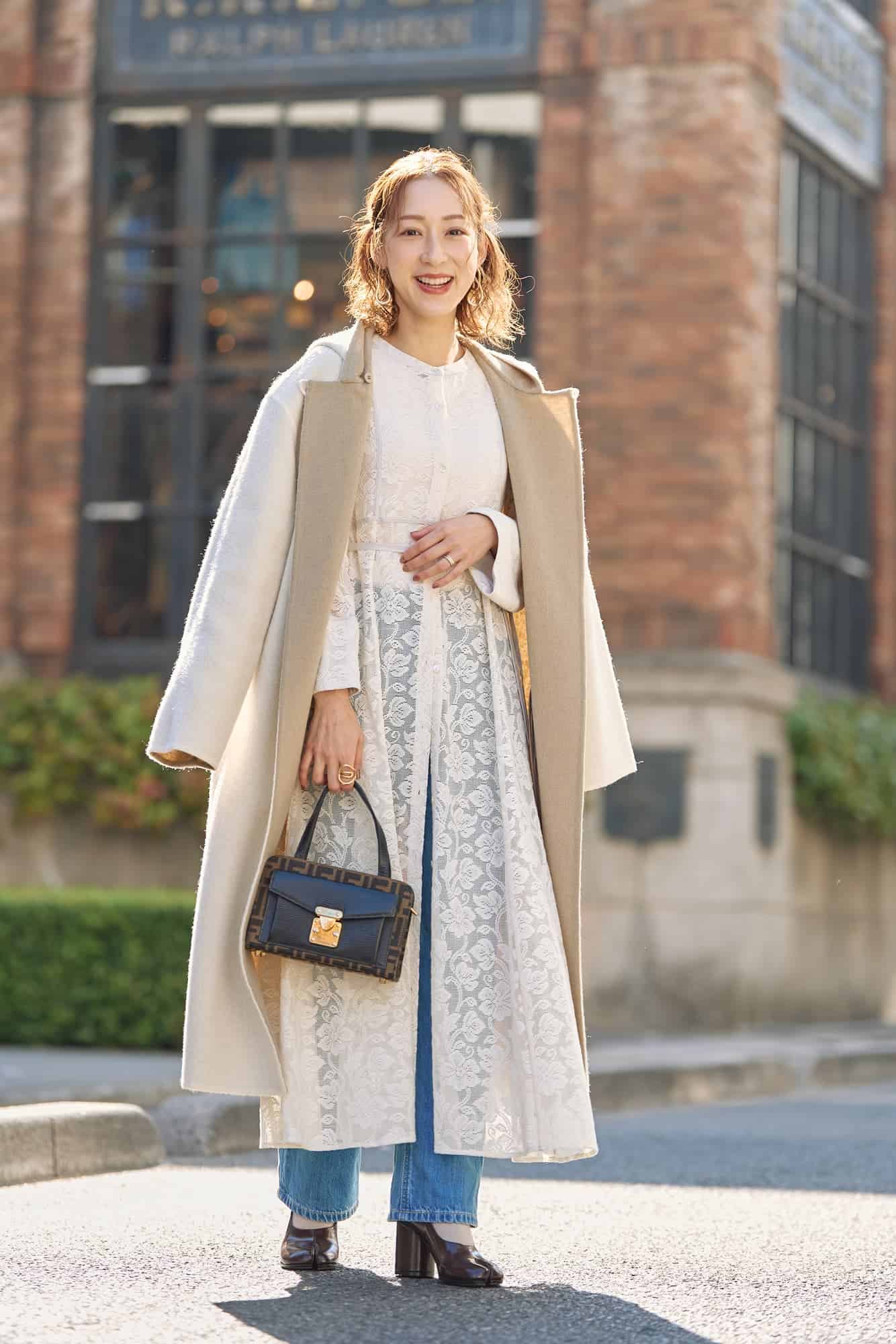 1枚で着るとドレッシーになってしまう白のレースワンピ。デニムと合わせて甘くなり過ぎないようにしました。このワンピースは動くたびに表情が出るので着るだけでコーデに華やかさをプラスしてくれます。季節を問わず着られるのもポイント。冬は同色ロングコートを羽織り、レイヤードスタイルを楽しみます。