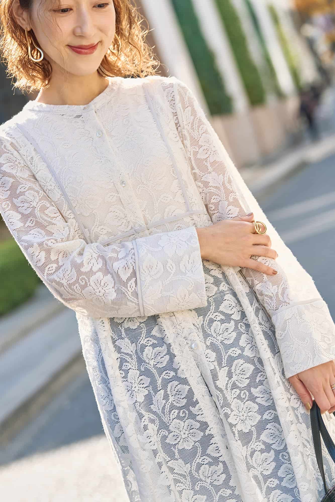 真っ白なレースワンピで上品な華やぎを纏う