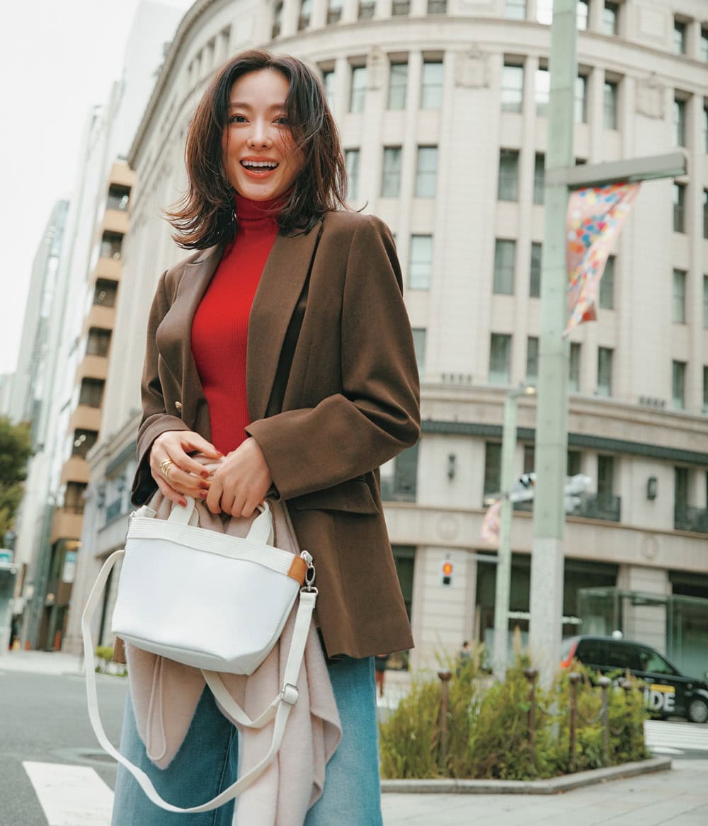バッグ(ミニミニ)¥9,900(ウイトート)ジャケット¥31,900(アルページュストーリー/アルページュストーリー プレスルーム)タートルニット¥22,000(ツル バイ マリコ オイカワ)パンツ¥25,300(ローラス/ジャック・オブ・オール・トレーズ プレスルーム)ストール¥41,800(エストネーション)リング¥13,200〈ワンエーアールバイウノアエレ〉(ウノアエレ ジャパン)