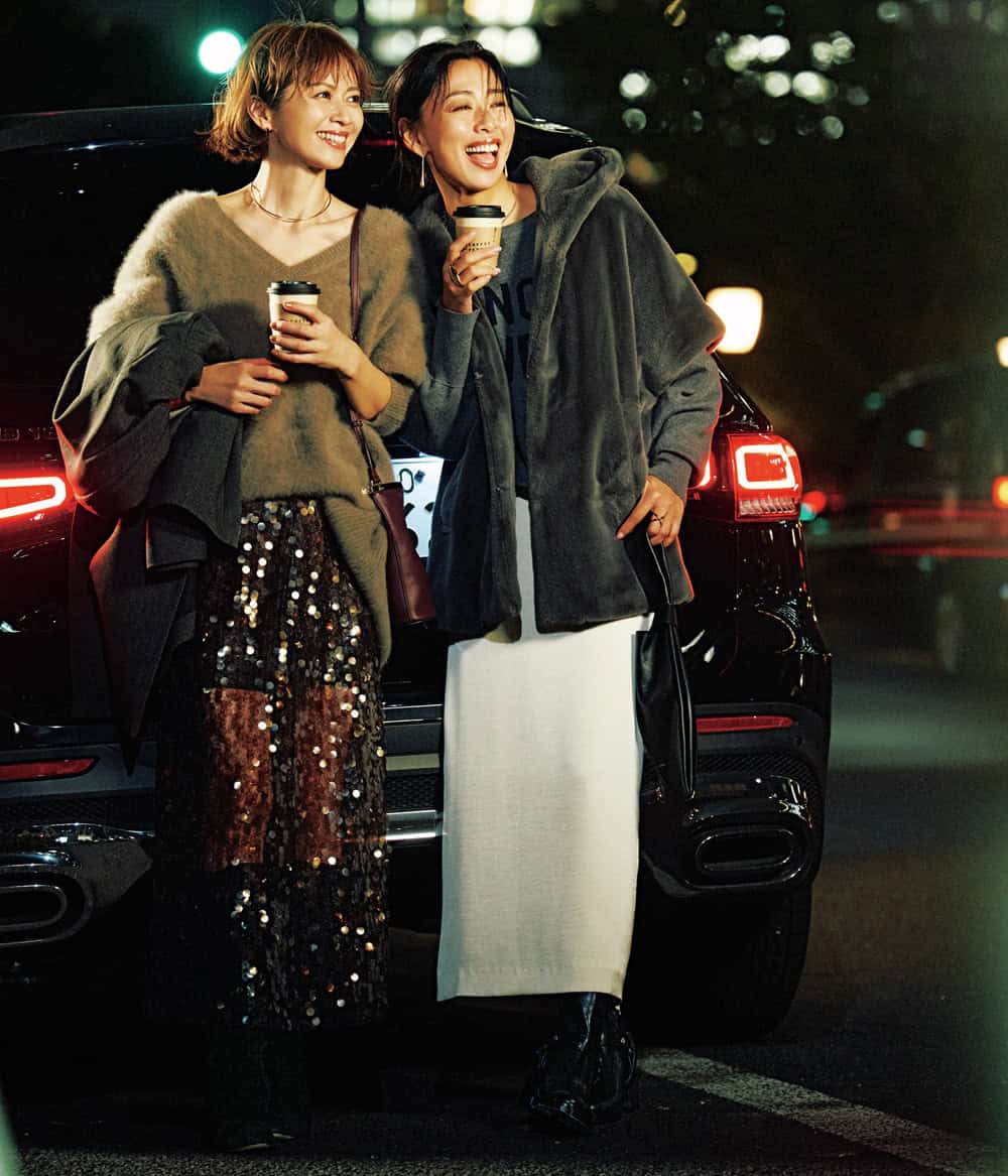 左:スパンコールとニットの柔らかさで肩肘張らないオシャレが完成
