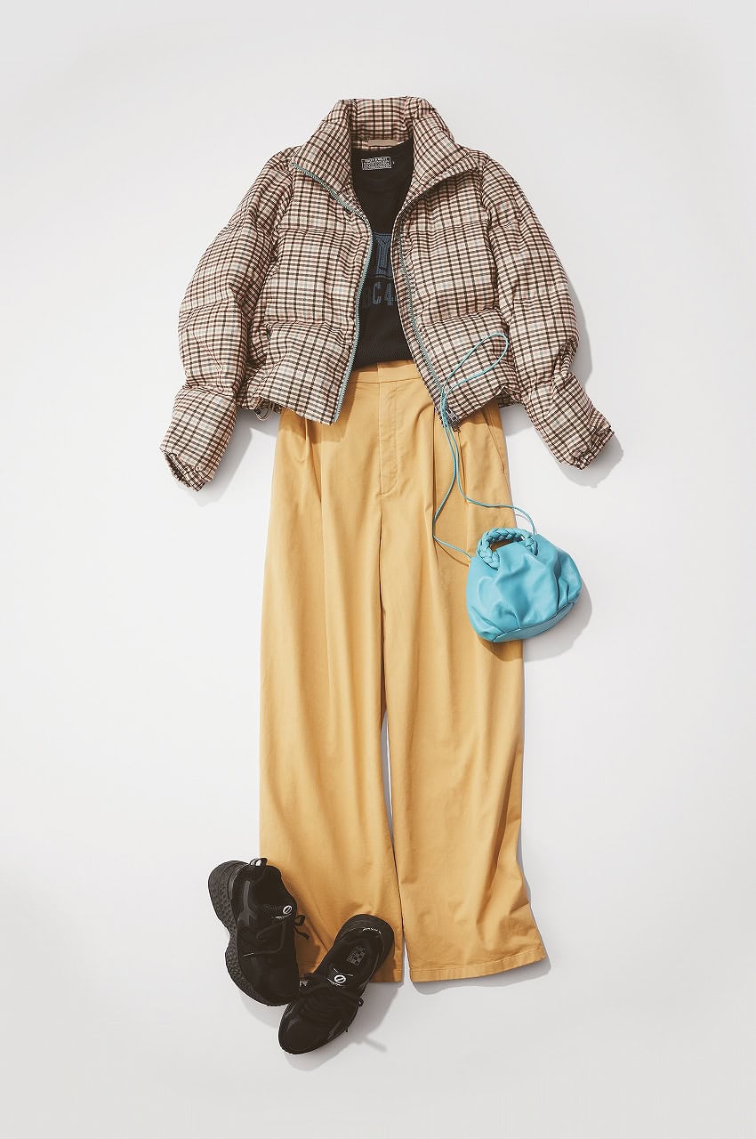 チェック柄ダウンジャケット¥104,500(ウールリッチ/ウールリッチ 二子玉川店)サーマルカットソー¥22,000(ヒステリックグラマー)パンツ¥39,600(ベイジ,/オンワード樫山 お客様相談室)バッグ[別注カラー]¥71,500(HEREU/ebure/リトルリーグ インク)スニーカー¥29,700(ノーネーム/ストックマン)