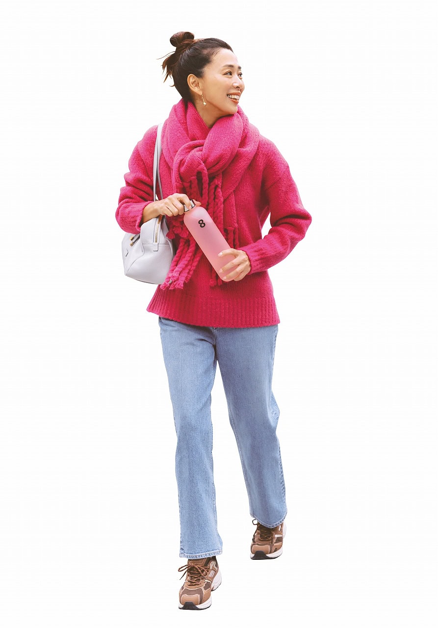ニット¥28,930マフラー¥19,910(ともに23区/オンワード樫山)デニムパンツ¥25,300(RED CARD for TOMMORROWLAND/TOMORROWLAND)バッグ¥69,300(ジャンニ キアリーニ/ジャンニ キアリーニ 銀座店)スニーカー¥31,900(モエア/アマン)ピアス¥36,300(プラウ)ボトルは私物。