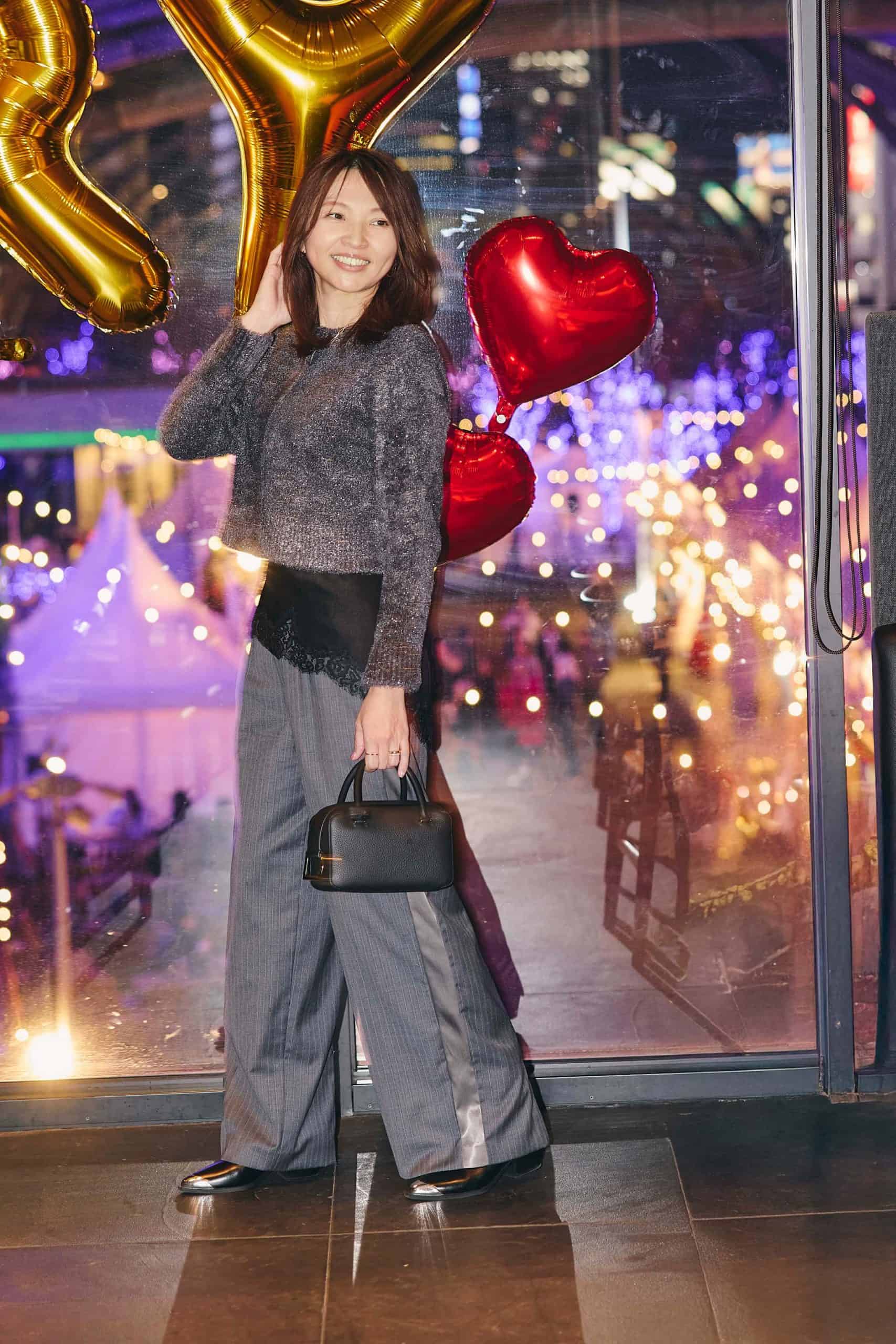 STORY の忘年会は毎年司会を担当しているので、華やかさを意識していますが、12月に入ると撮影やイベントが多く、着る服が無くなって困ることも。ダブスタのニットはラメの輝きやチュールのデザインで、一枚で華やか見えするのでこの時期に大活躍。全身は落ち着いたトーンでまとめつつ、クリスマスプレゼントで購入したヴァレクストラのバッグの赤で色をプラスしました。