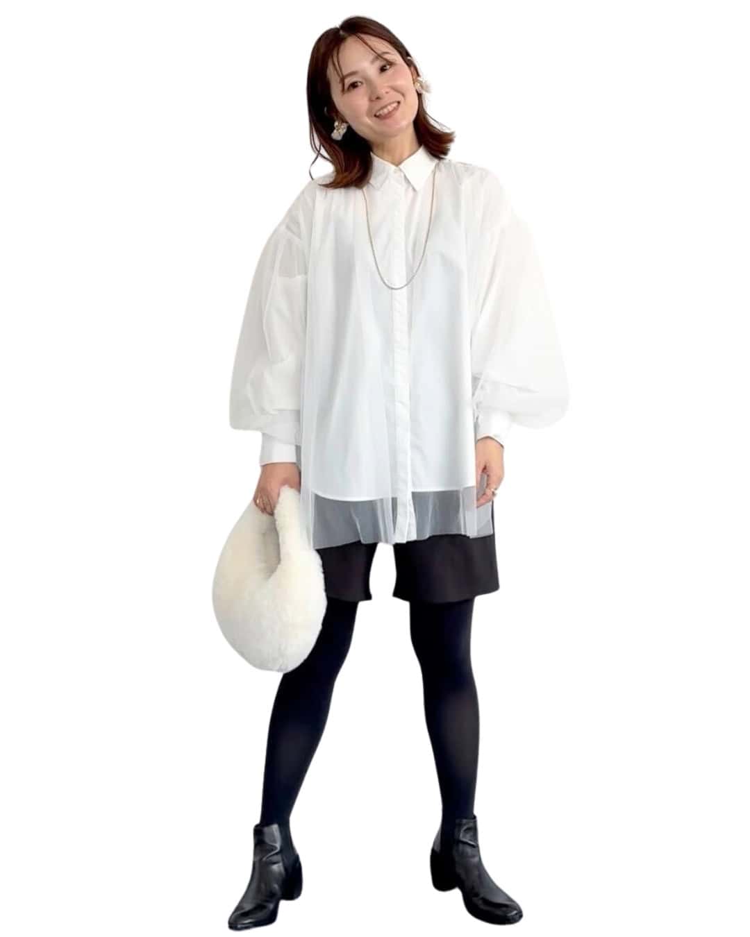 ★ ③大人のモノトーンコーデには盛れる「チュールシャツ」が最適!