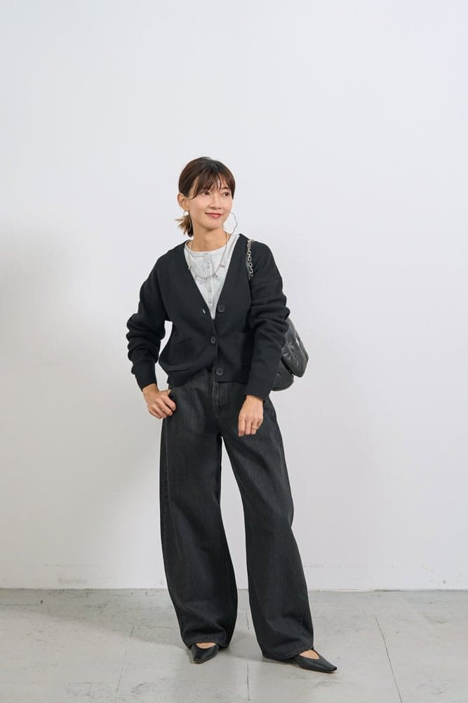 「黒でまとめる日は、サイズ選びが大事。デニムはあえてサイズアップして、今っぽいゆるさをプラスしました。トップスは逆に短めにすることでメリハリをつけています。グレーのインナーとシルバージュエリーで、抜け感と大人のこなれ感を意識。シンプルなユニクロアイテムはアレンジがしやすく、ほぼ黒コーデの幅も無限大です。」
