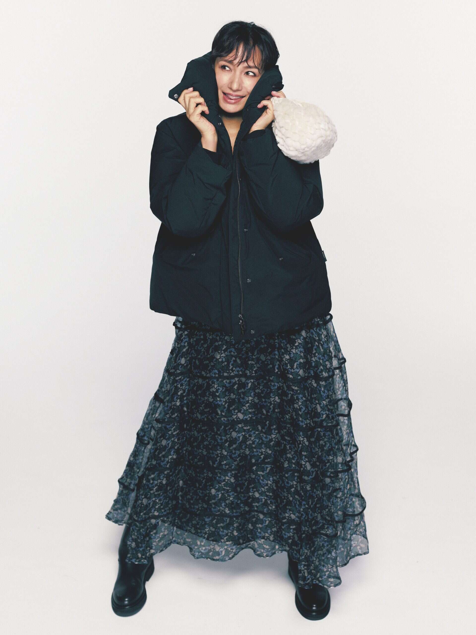 ダウンジャケット¥107,800(ウールリッチ/ウールリッチ 二子玉川店)ワンピース¥165,000(マーレット/リトルリーグ インク)バッグ¥83,600(ヘリュー/ショールーム セッション)ブーツ¥62,700(ギャルリー・ヴィー/ギャルリー・ヴィー 丸の内店)