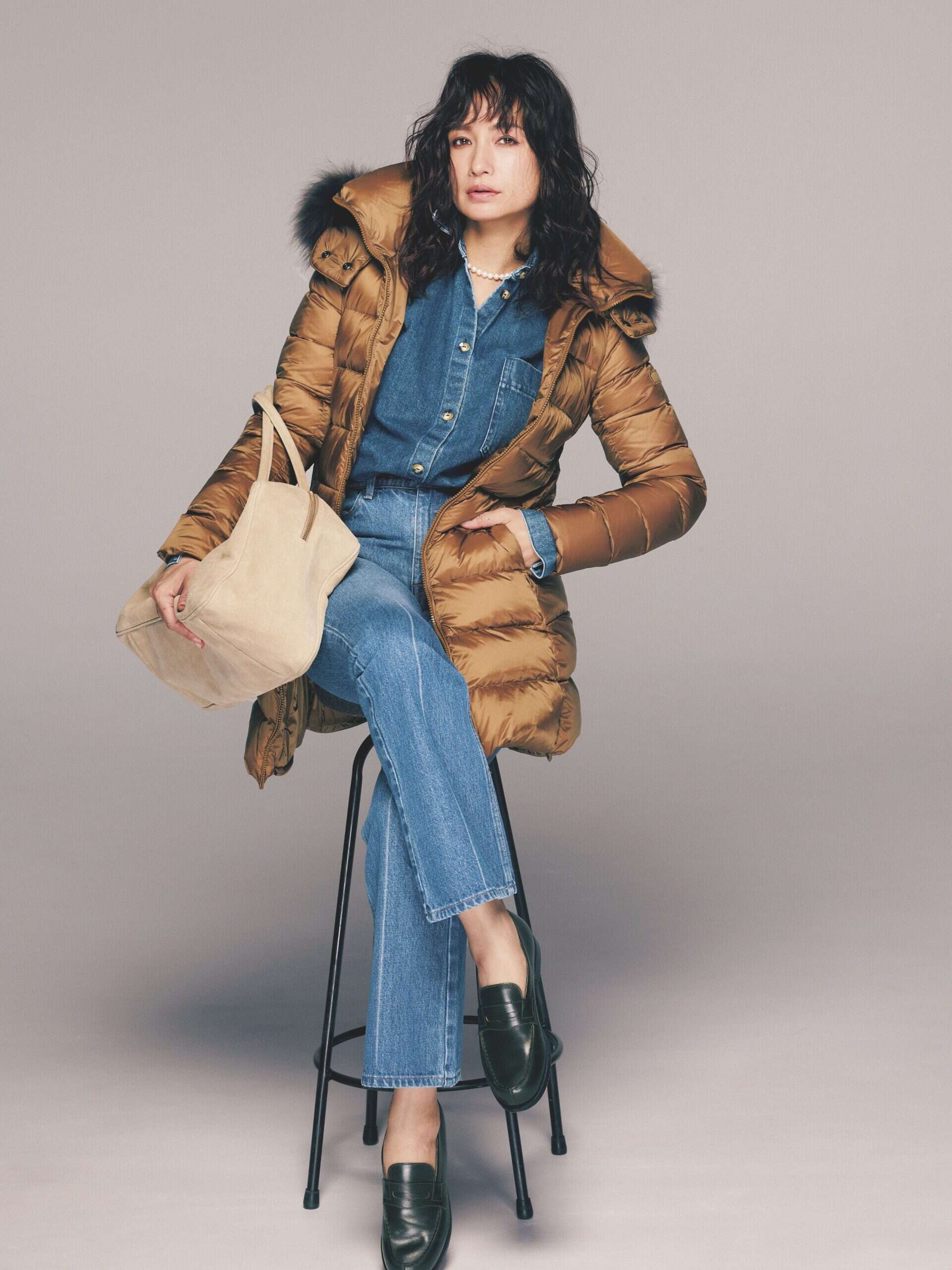 ダウンジャケット¥195,800(タトラス/タトラス カスタマーセンター)デニムシャツ¥66,000(アキン/ユナイテッドアローズ 麻布台ヒルズ ウィメンズストア)デニムパンツ¥28,600(ネイル/エストネーション)バッグ¥49,500(モフィオラ/アマン)ローファー¥156,200(J.M. WESTON/ジェイエムウエストン 青山店)ネックレス¥101,200(ビジュードエム/ビジュードエム六本木ヒルズ)