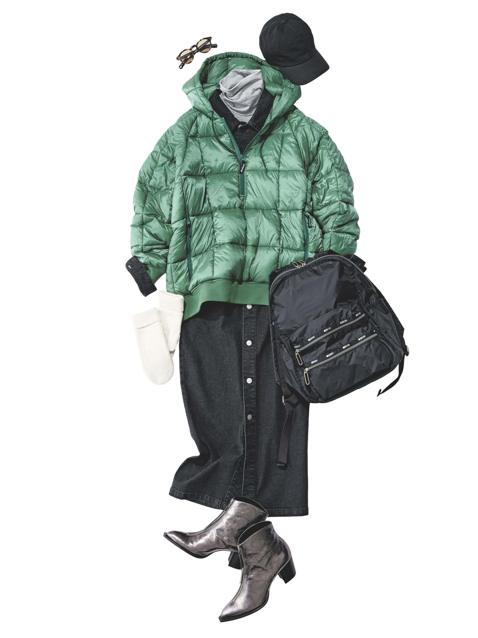 ほどよくフィット感のある、かぶるタイプのダウン。モードな引き締めグリーンも手伝って、スッキリした印象に。リーンなシルエットの黒ワンピを合わせれば、よりスッキリとした印象に。ハイネックで防寒力もアップさせて。