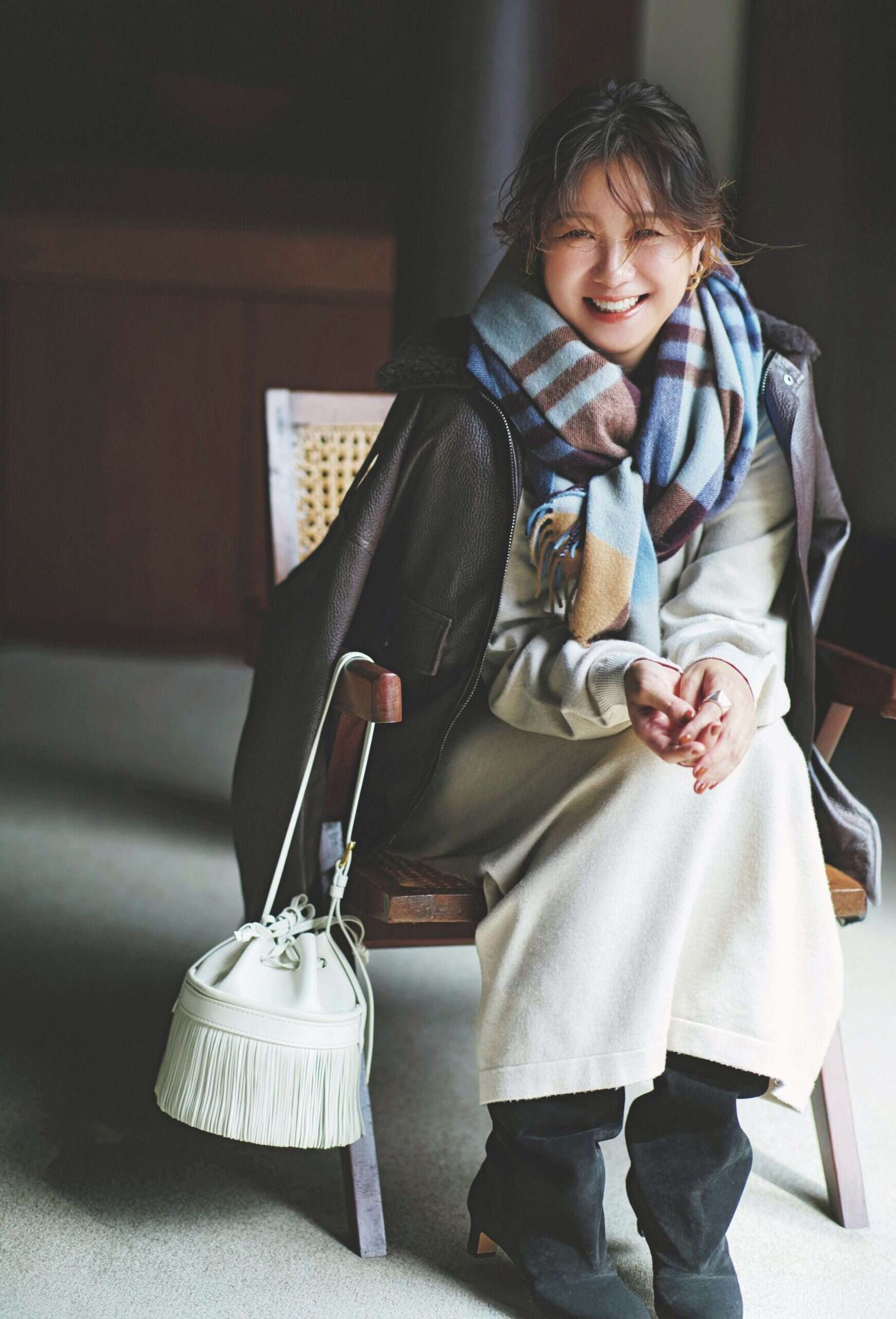 マフラー¥93,500(ジョシュアエリス/真下商事)ワンピース¥36,300(ロンハーマン)ジャケット¥248,600(ジョルジオ ブラート/コロネット)バッグ¥148,500(J&M デヴィッドソン/J&M デヴィッドソン カスタマーセンター)ブーツ¥110,000(ネブローニ)ピアス¥3,850(ヘンカ/ロードス)リング[左手]¥44,000(ブランイリス/ブランイリス トーキョー)
