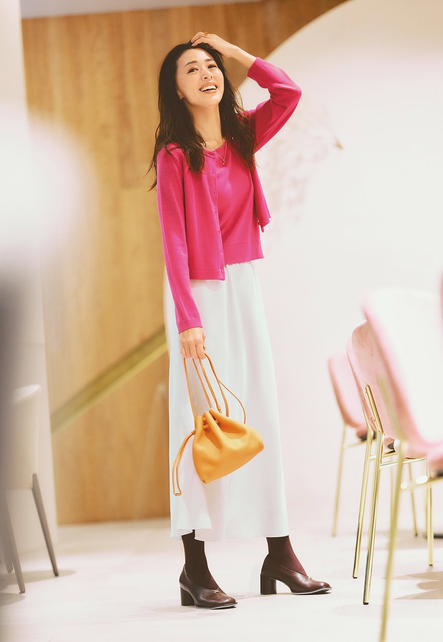 マゼンタニットカーディガン¥28,600ニット¥23,100(ともにルル・ウィルビー/アルアバイル)スカート¥42,900(DES PRÉS/DES PRÉS)オレンジバッグ¥88,000(ボナベンチュラ)7ペンダントトップ¥111,100ネックレスチェーン¥375,100(ともにNo./ナンバードット)パンプス¥19,800(ル タロン グリーズ/ル タロン グリーズ ルミネ新宿店)オレンジリング¥176,000パールリング¥178,200(ともにマリハ)タイツ/スタイリスト私物