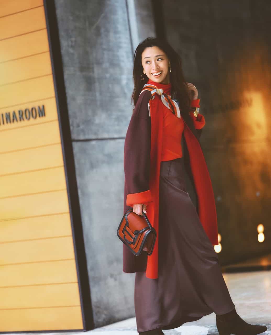 リバーシブルコート¥121,000(ADORE/ADORE 六本木ヒルズ店)タートルニット¥8,910(ビューティー&ユース/ユナイテッドアローズ 渋谷スクランブルスクエア店)サテンスカート¥20,900〈MACPHEE〉ブーツ¥55,000〈FABIO RUSCONI〉(ともにTOMORROWLAND)スカーフ¥22,000(マニプリ)バッグ¥187,000(ピエール アルディ/ピエール アルディ 東京)時計¥36,300(リップ/エイチエムエスウォッチ表参道)ピアス¥42,900バングル¥137,500リング¥47,300(すべてASAMIFUJIKAWA/ショールーム セッション)