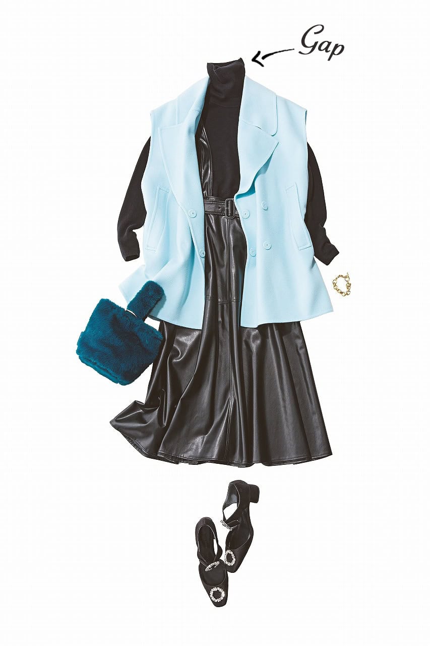 ジレ¥74,800(LE PHIL)ニット¥9,990(Gap)ジャンパースカート¥59,400(ANAYI)バッグ¥35,200(銀座かねまつ/銀座かねまつ6丁目本店)パンプス¥35,200(ツル バイ マリコ オイカワ)ブレスレット¥19,800(アドラル/ZUTTOHOLIC)