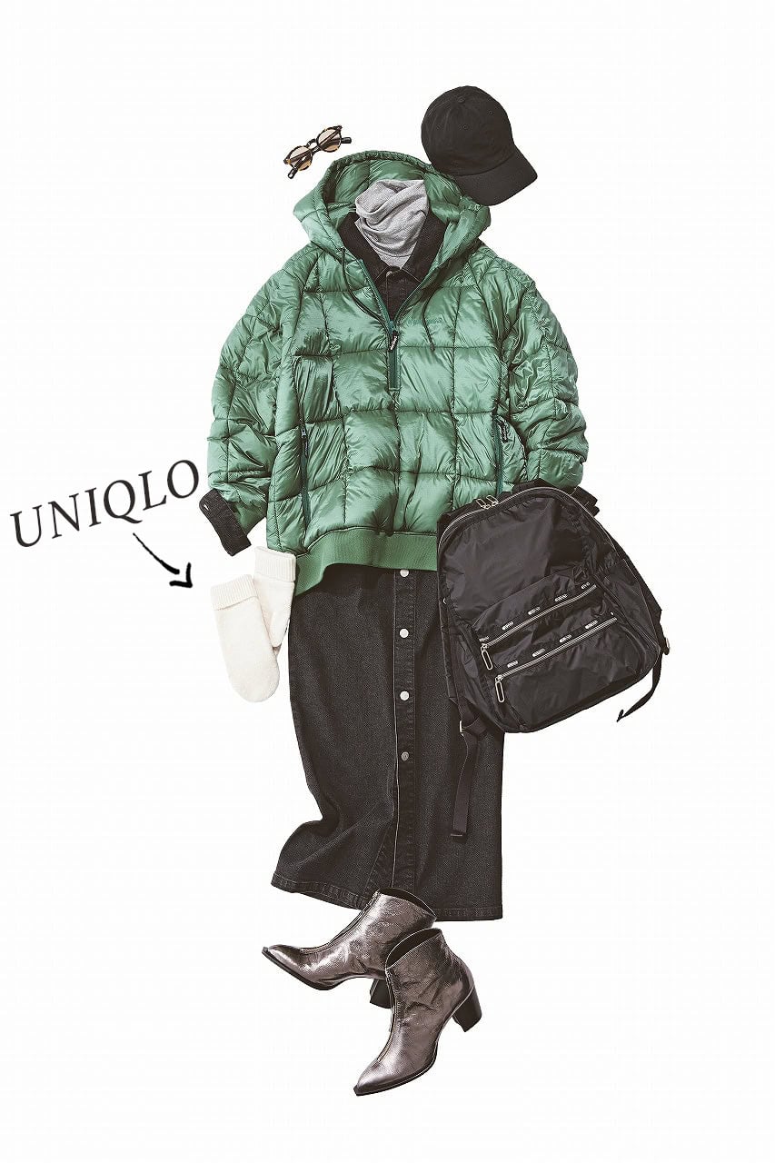 オールブラックにはグリーンアウターで軽やかに更新。デニムワンピのボーイッシュさも、色の力で爽やかに整います。ユニクロのヒートテック手袋なら、暖かさと肌ざわりの良さで信頼感抜群。