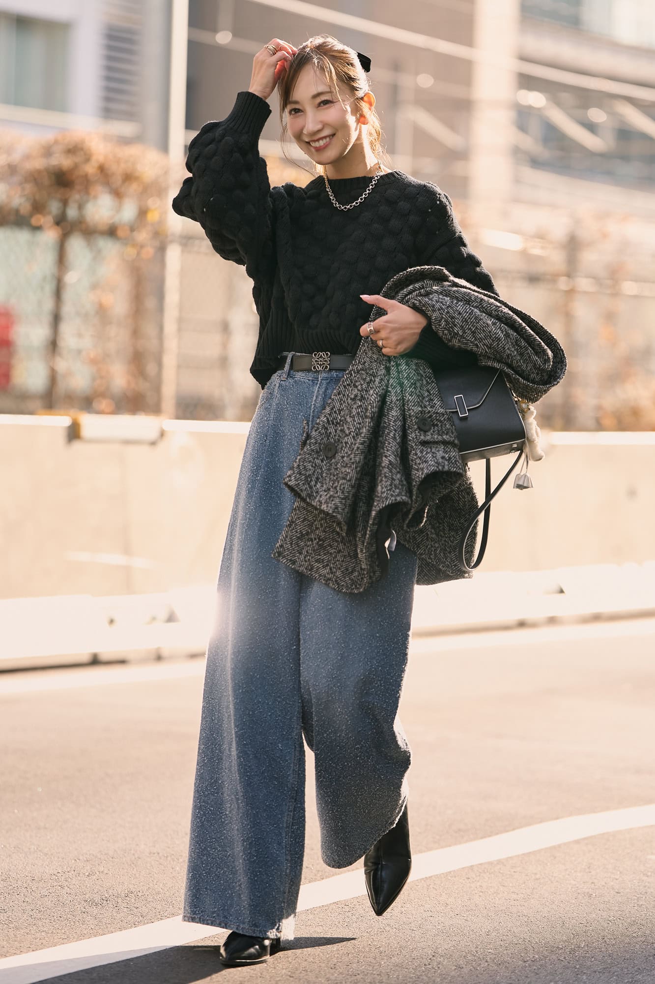 ぽこぽことした立体感ある生地と、目を惹くバックデザインに一目ぼれしたニット。シンプルなボトムスに合わせるだけでコーデが即決まり、短丈なのでボトムスも選ばずバランス良く決まるのが嬉しいポイントです。デニム合わせでカジュアルダウンして、足元はブーツ、バッグはかっちりしたものを選んで“大人仕様”に。ミックス地のコートを羽織ればシンプルでも表情のあるデイリーコーデが完成です。