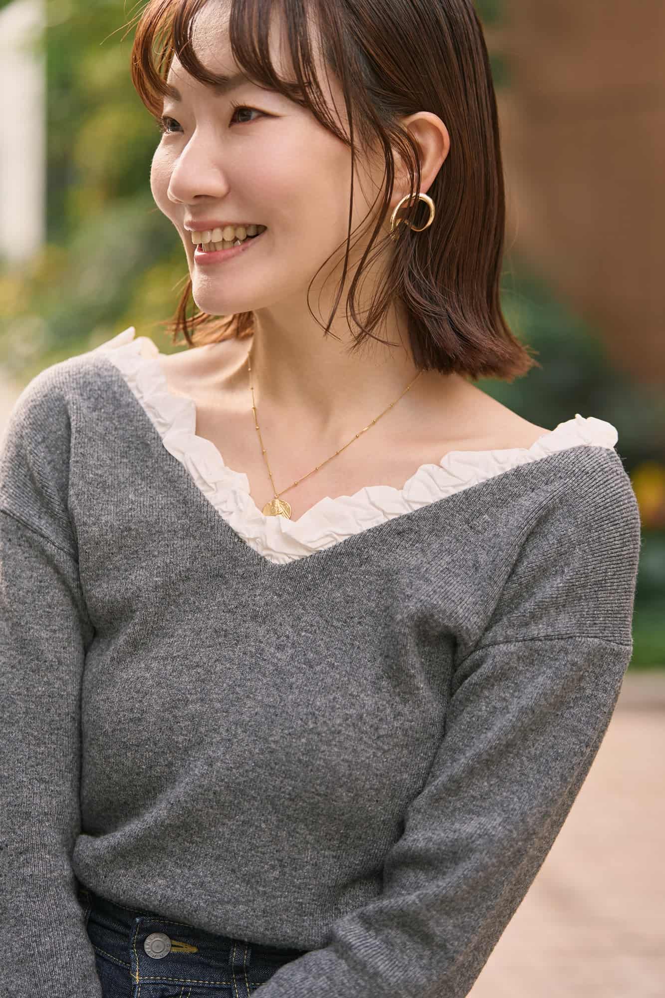今年追加したニットは骨格ストレートの私でも、デコルテがきれいに映えるVネックでスッキリ見えが叶う理想の1枚です。さり気なく効いたフリルが程よいアクセントになって、冬のニットスタイルに華やぎを添えてくれるのも嬉しいポイント。インディゴカラーのデニムに足元はマルジェラの足袋ブーツでピリッと大人のエッジをプラスして、大人の甘辛バランスに仕上げました。