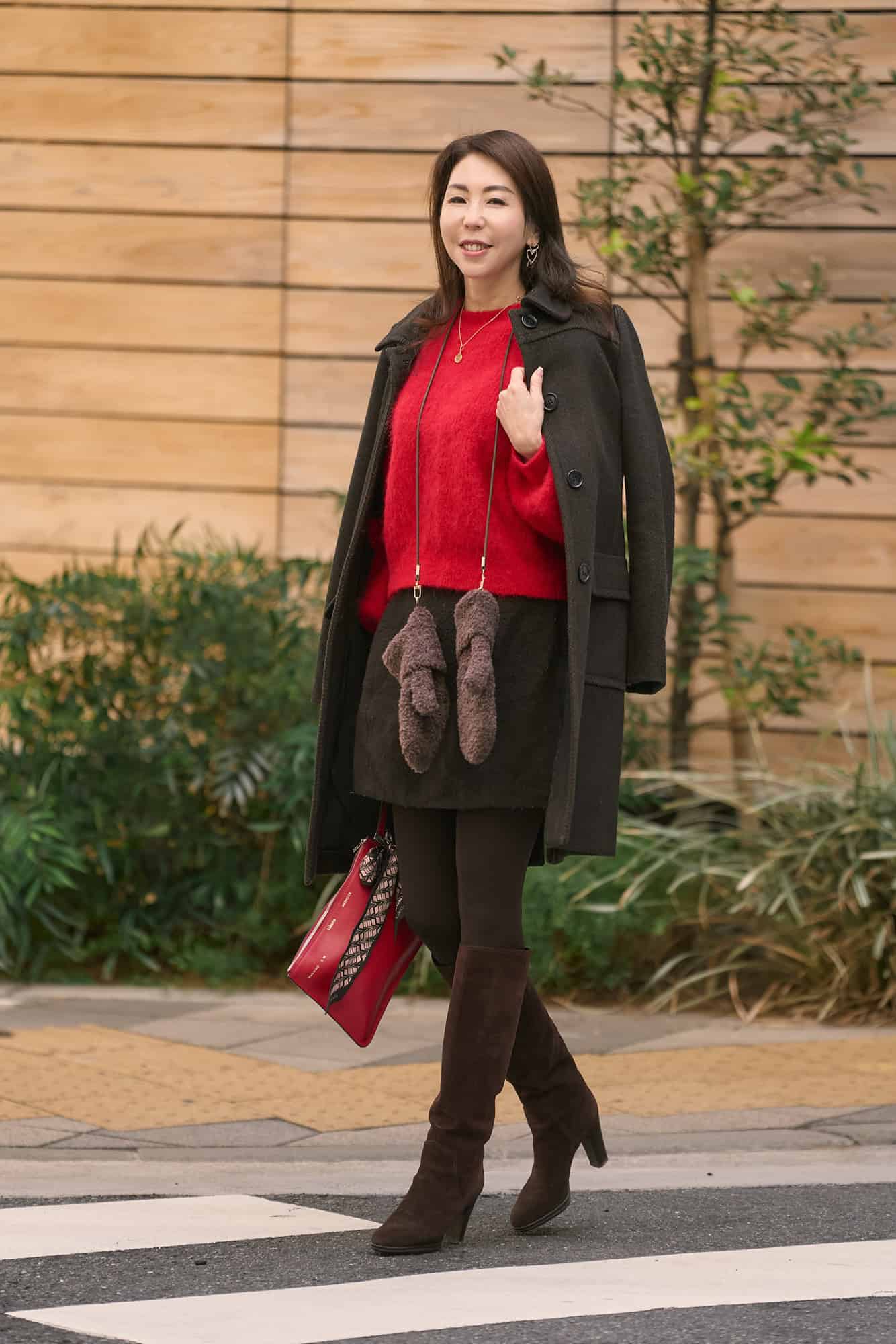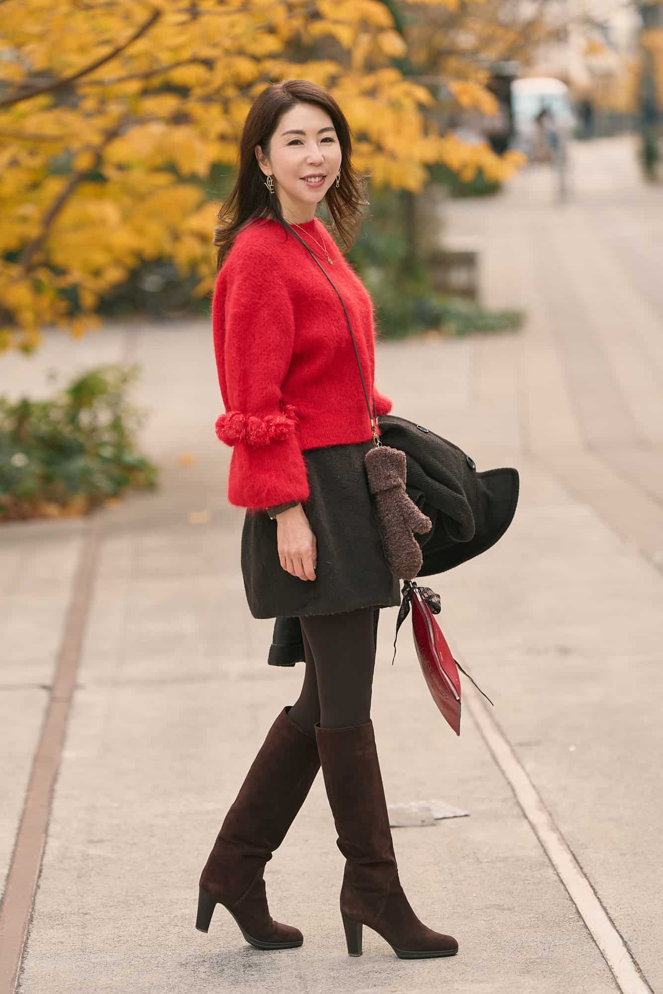 毎年必ず訪れる「ドレスコード赤」のイベントで着用できるニットを探している時に出会った赤ニット。クリアな赤色に袖の丸みやポンポンが可愛く一目惚れでした。あえて黒ではなく、チョコレートブラウン合わせで今年らしく。ミトンやバッグなどの小物をカラーをリンクさせて、コーデ全体にリズムをプラス。赤の華やかさを程よく引き算してくれる大人コーデに仕上げました。