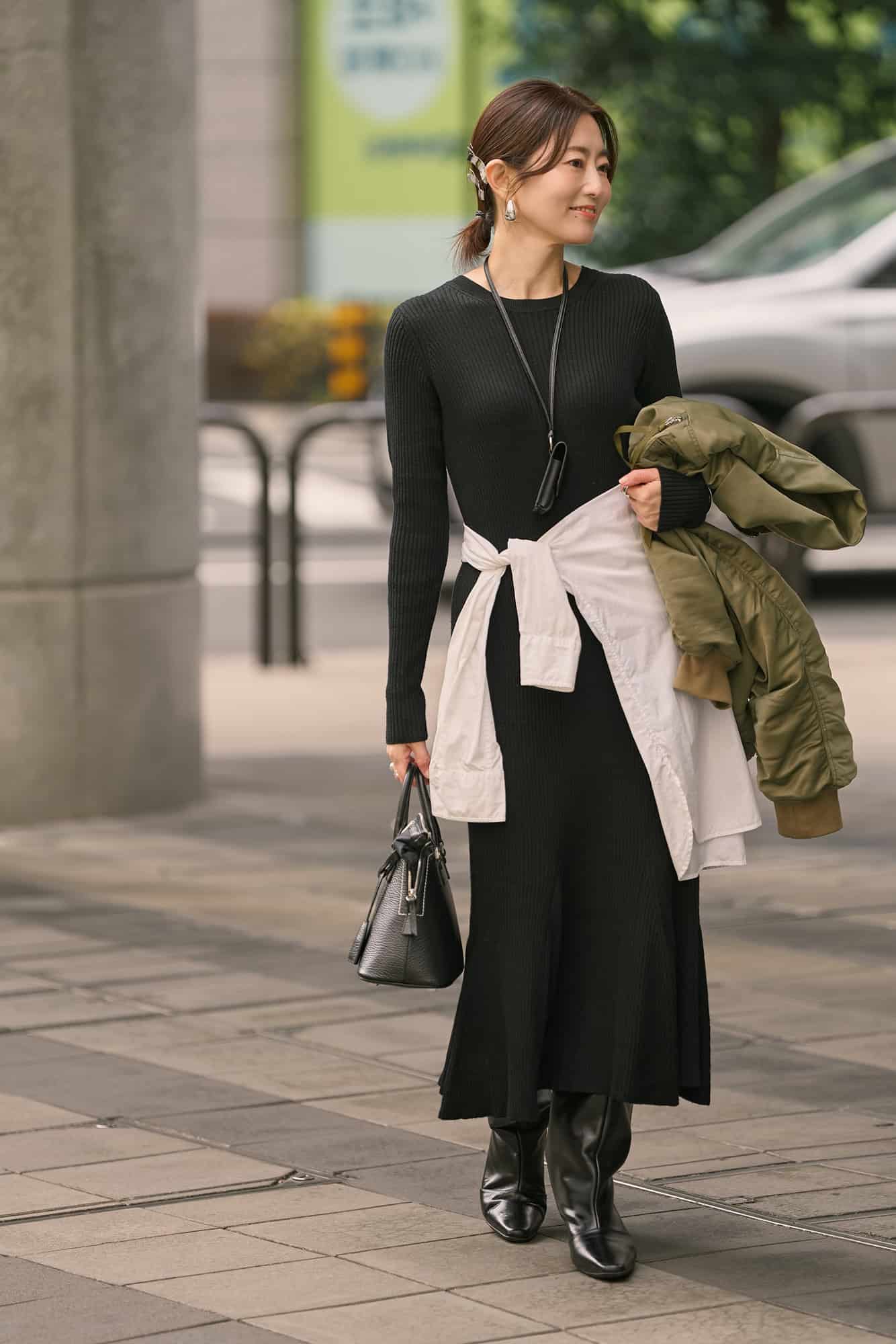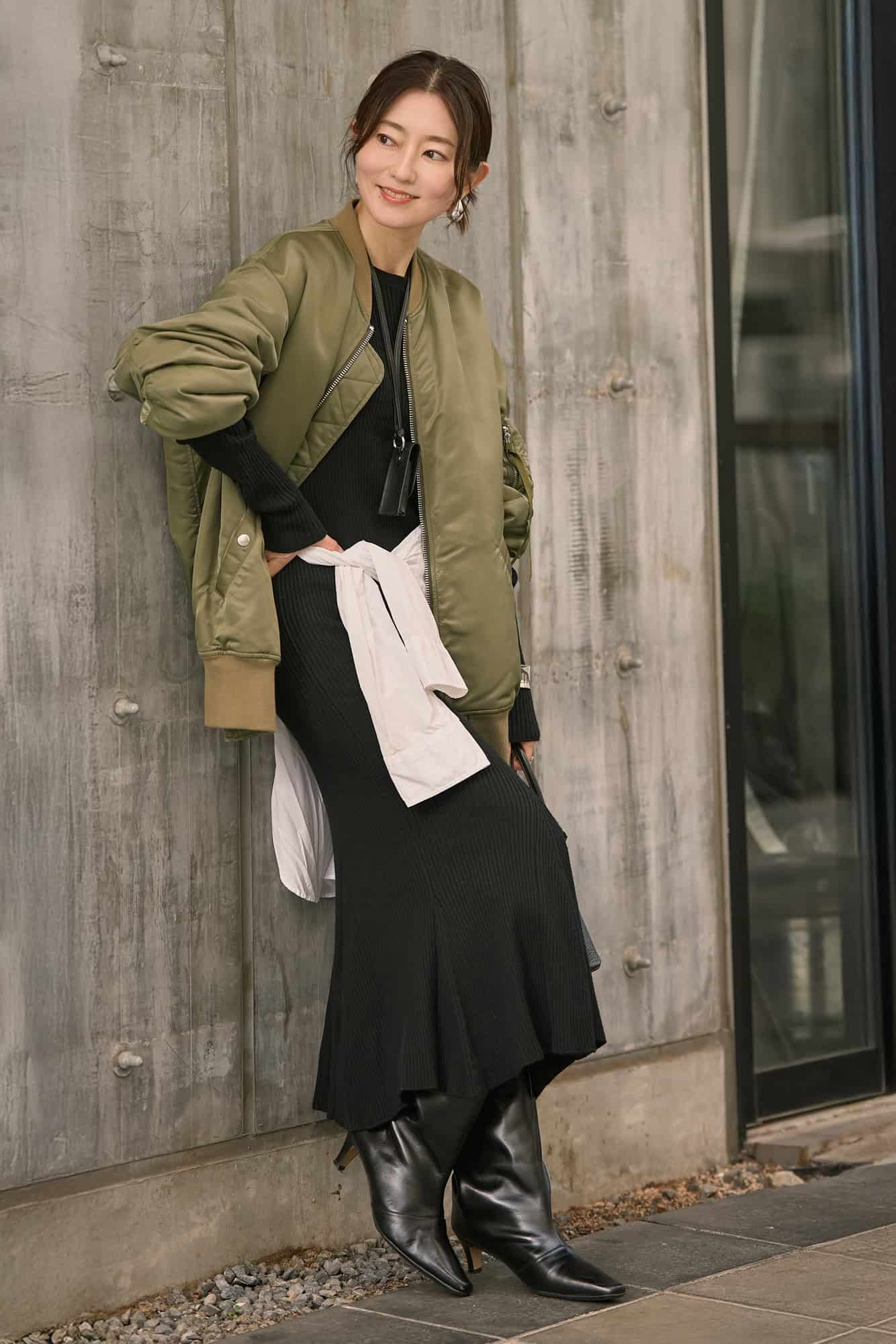 ニットワンピースは、体のラインを拾いすぎないのに女性らしいシルエットで、シンプルだからこそ着回しも効くと去年の冬に購入。MA-1を合わせてカジュアルダウンして、白シャツを腰巻きにしてコーデにリズムと抜け感をプラスしました。ヘアはすっきりアップにしてheyepのヘアピンで華やぎを、アクセサリーはシルバーで揃えてピリッとアクセントを効かせて。