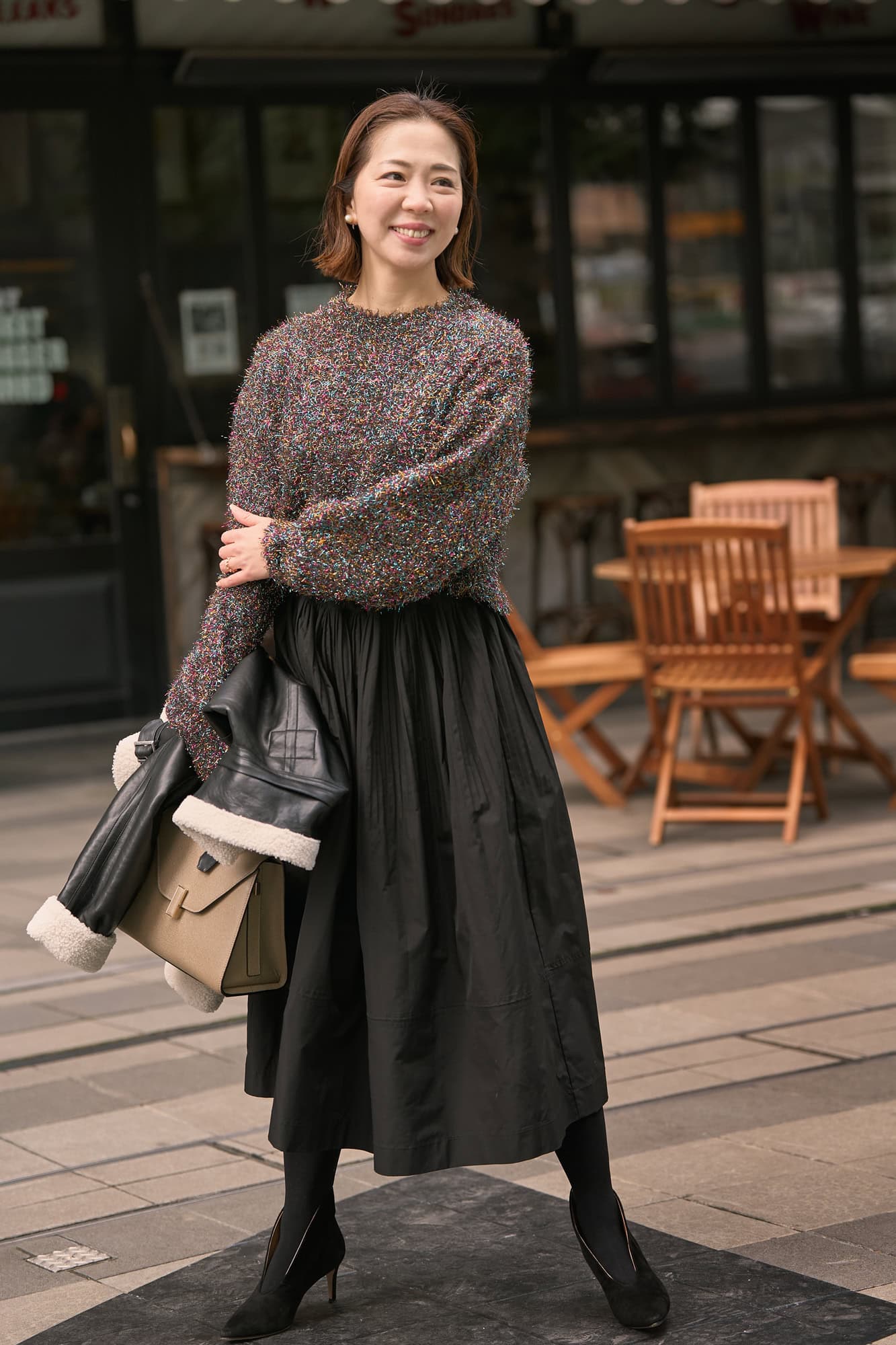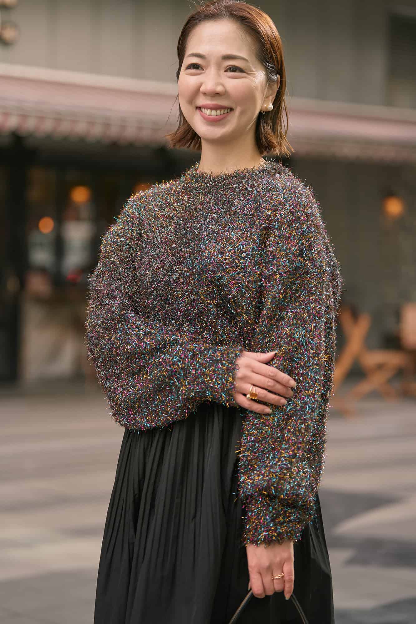 多色使いのキラキラとした糸が、誰とも被らず「ナイトアウトに最適!」と選んだもの。短丈デザインなので、どんなボトムスとも相性良くスタイルアップが叶うのも嬉しいポイントです。トップスが華やかなので、ブラックのふんわりスカートを合わせて個性派ながらもどこか好感の持てる印象に。特別な夜に気分を格上げしてくれる大人コーデに仕上げました。