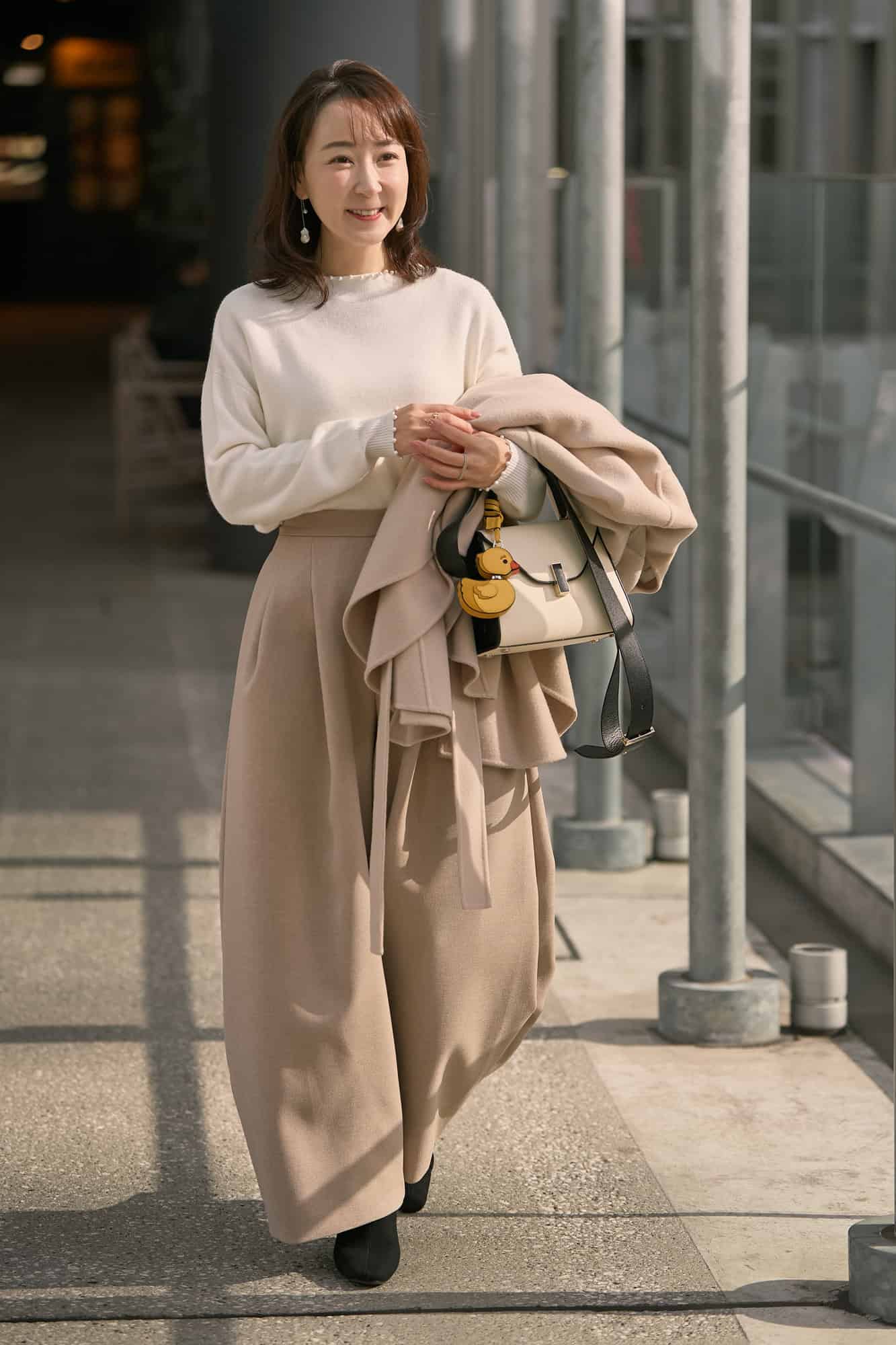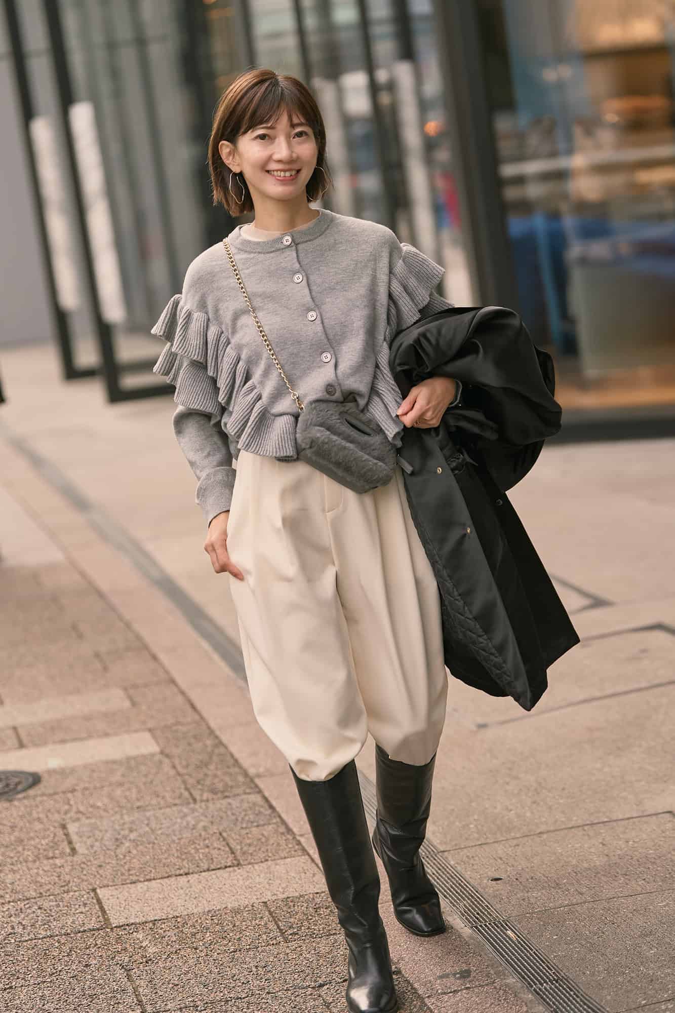 ベーシックカラーなのに1枚で存在感と華やかさがあるニットはセレクトショップで出会ったもの。しっかり暖かいのに、ニットではなかなか見かけないボリューム感がある袖のフリルが可愛くて一目惚れしました。今年は白のパンツをロングブーツにINして更新感を出して。ツヤ感あるロングコートを合わせてメリハリある大人のモノトーンコーデに仕上げました。