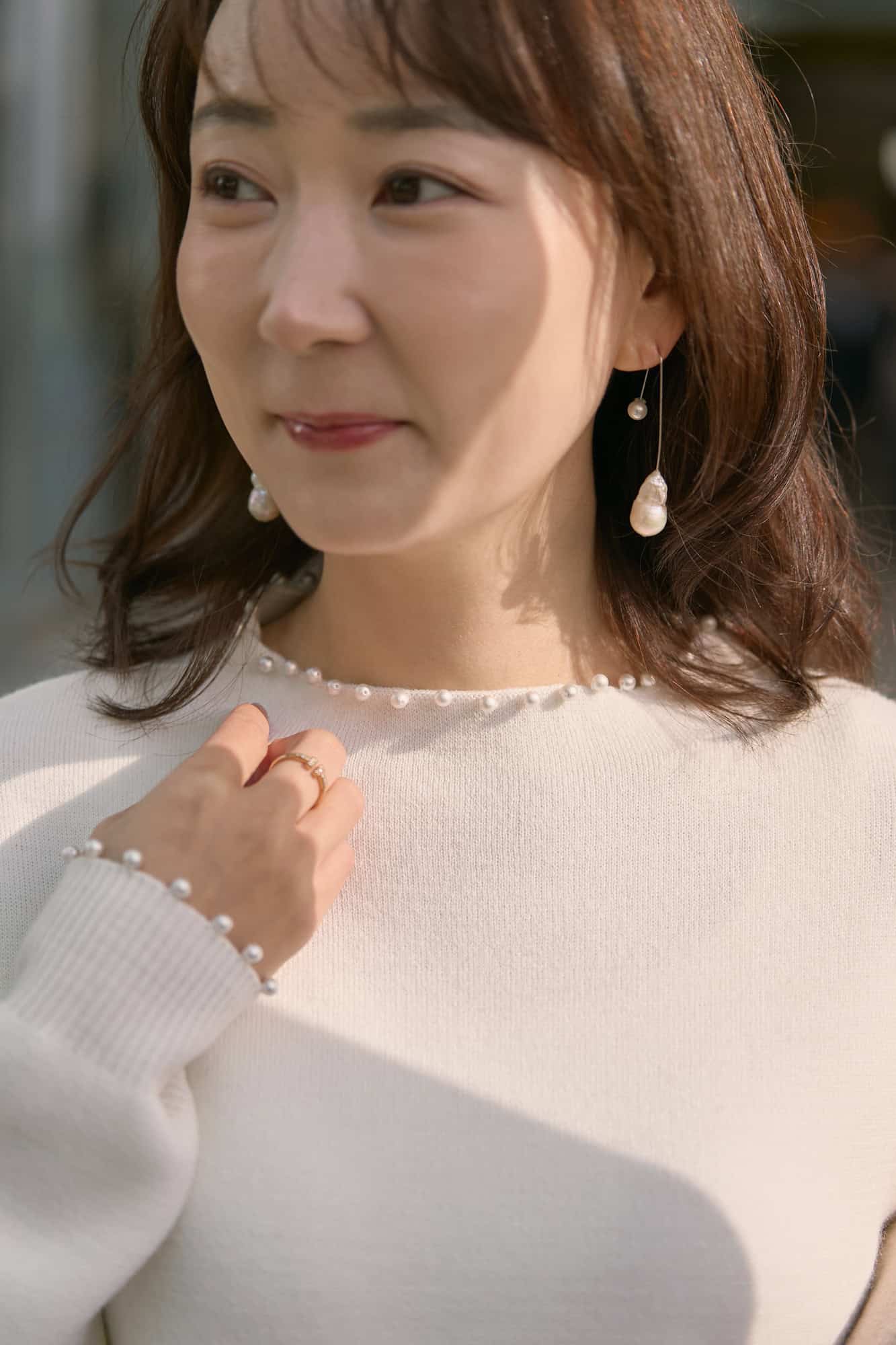 顔まわりをパッと華やかに見せてくれる襟元のパールと、優しい肌心地に一目惚れ。INもOUTも選ばない丈感も嬉しく、ドレッシーながらカジュアルに着こなせる万能さも◎。ふんわりシルエットが愛らしい一癖デザインのパンツを合わせて、甘さを抑えつつ柔らかな女性らしさを演出。全体をベージュトーンで揃えるとコーデが品よくまとまります。