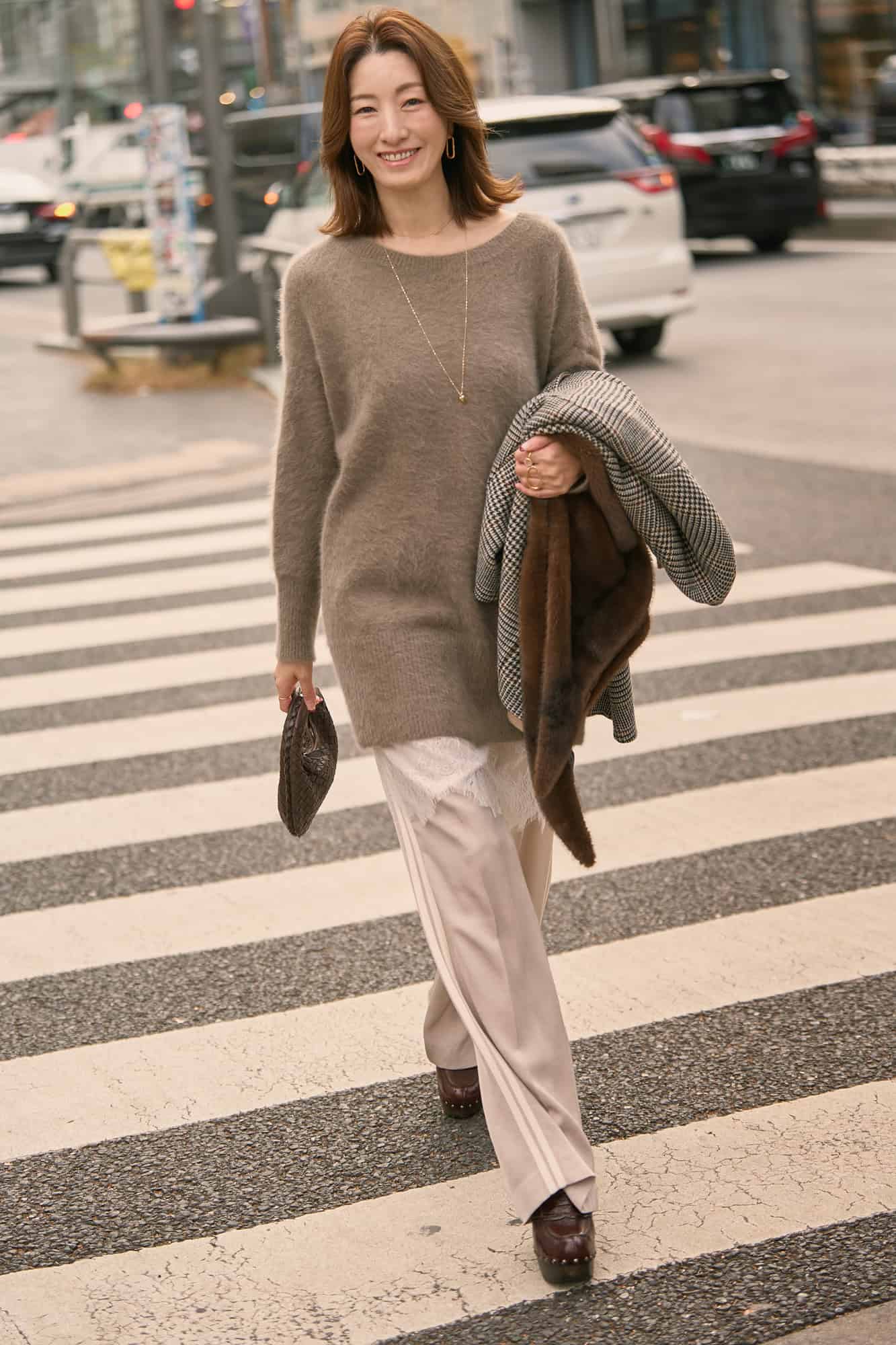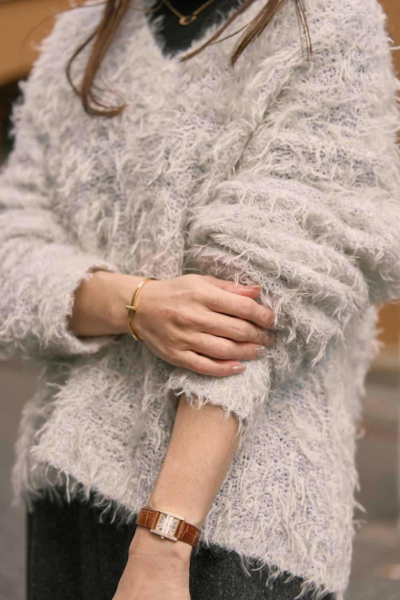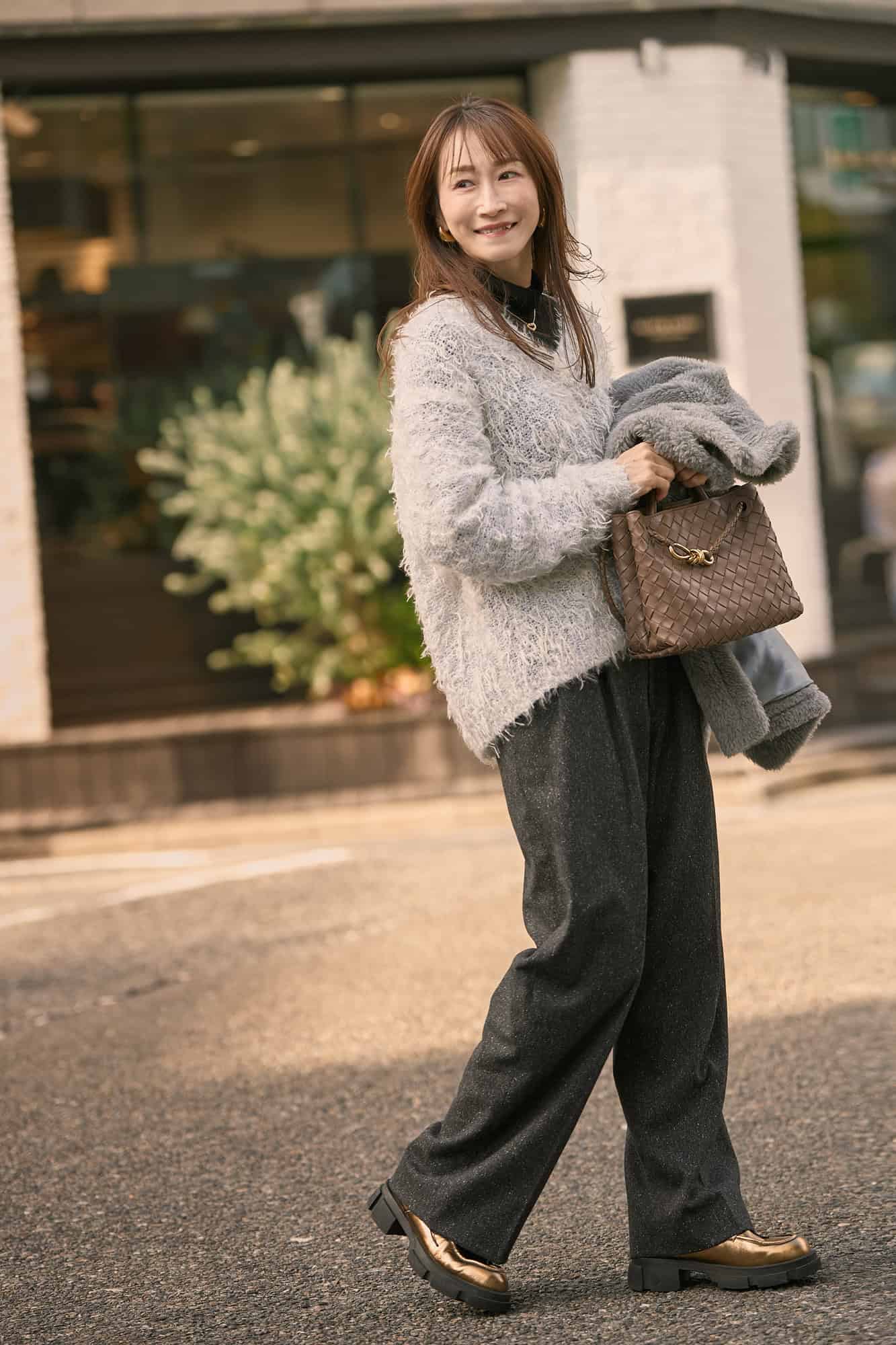 ダークトーンが増えがちな冬は【白シャギーニット】で顔まわりを明るく