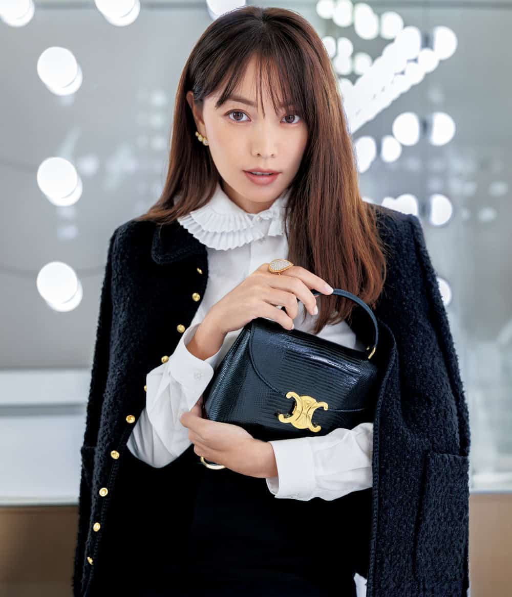 ジャケット、ブラウス、スカート、ベルト、バッグ(すべてセリーヌ/セリーヌ ジャパン)リング、イヤリング(ともにブシュロン/ブシュロン クライアントサービス)