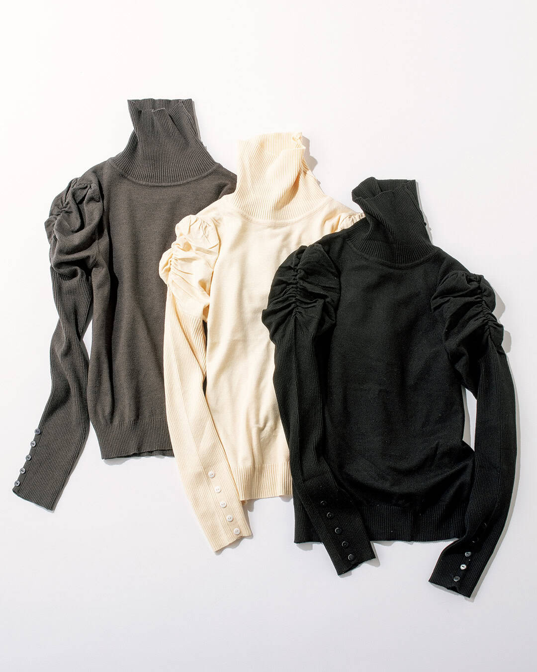 インナーとしても重宝するタートルニットは、肩のギャザーや袖口のライン上に並んだ飾りボタンなど甘ディテールのお陰で1枚でもしっかり間が持つ逸品です。