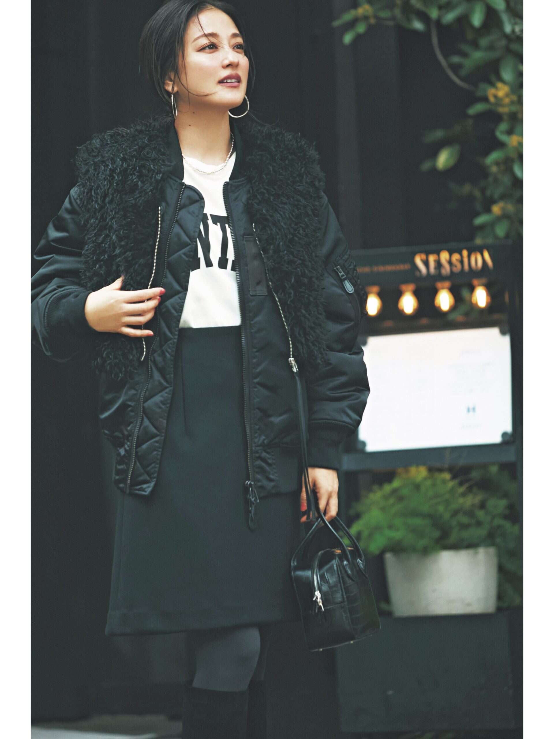 ピアス¥26,400(ブランイリス/ブランイリス トーキョー)ボアベスト¥22,000(メゾンスペシャル/メゾンスペシャル 青山店)MA-1¥88,000(ハイク/ボウルズ)カットソー¥14,300(ウィム ガゼット/ウィム ガゼット 玉川髙島屋S・C店)スカート¥39,600(エムティーモデリスト/ロンハーマン)バッグ¥82,500(メゾン カナウ/ヤマニ)ブーツ¥110,000(ネブローニ)ネックレス¥50,820(バルブス/ズットホリック)タイツ¥1,650(靴下屋/タビオ)