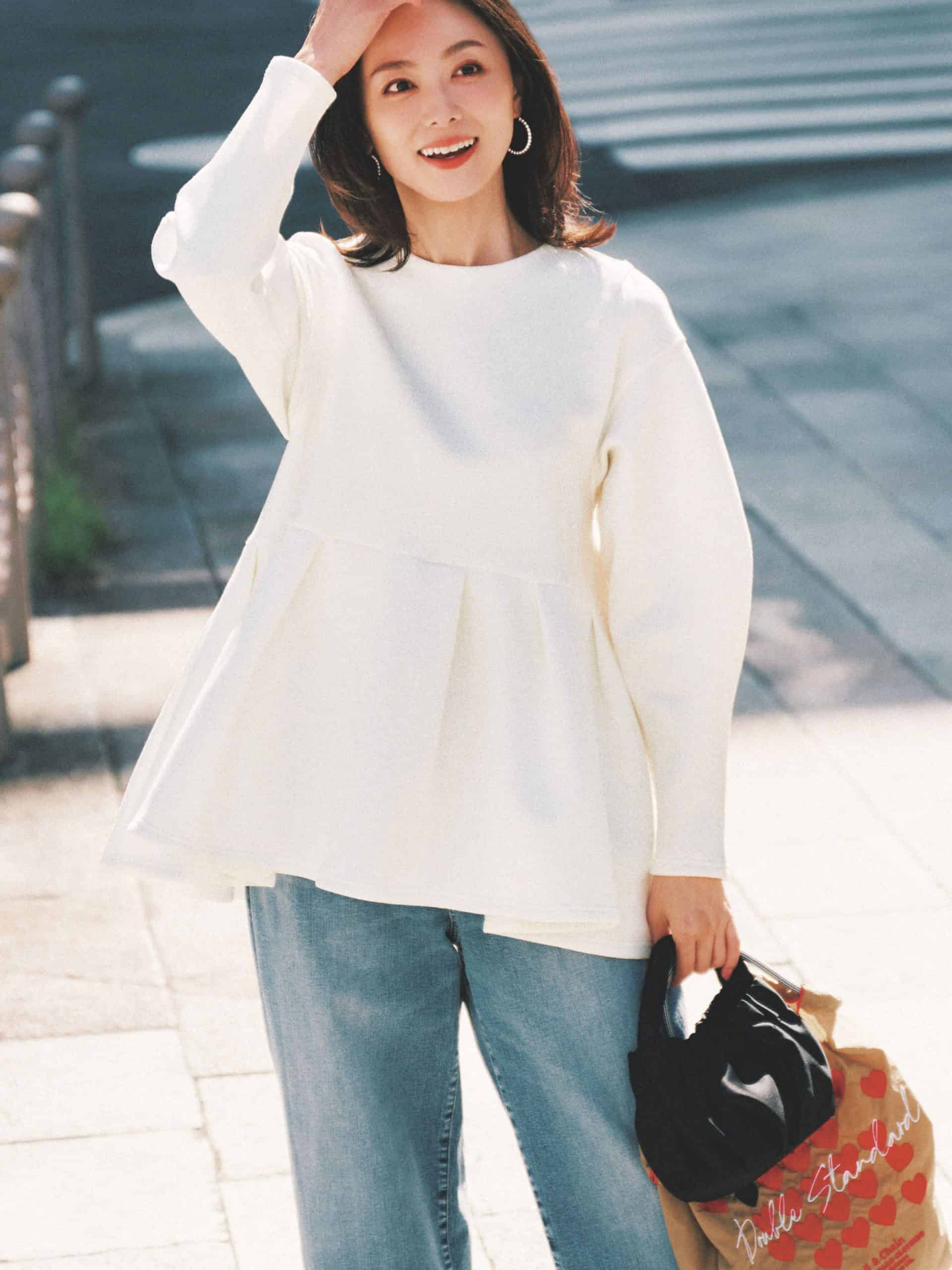 ピアス¥11,000(ワンエーアールバイウノアエレ/ウノアエレ ジャパン)カットソー¥14,300(アレア)トートバッグ¥6,050(ダブルスタンダードクロージング)パンツ¥9,990(アンフィーロ〈オンワード樫山〉)バッグ¥15,400(アコック/ジャック・オブ・オール・トレーズ プレスルーム)