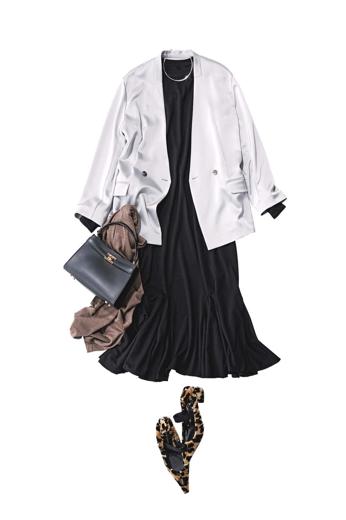 キリッと感とラグジュアリーさを併せ持つ装いには、艶を効かせすぎない微糖ワンピース。威圧感のある輝きは避けたいから、シャイニーすぎない素材感で、静かにきらめかせるのが正解。直線的なシルエットに、ほんのり甘さを含んだワンピを差し込めば、ほぼクロの配色も硬くなりすぎず、余白のあるムードに。