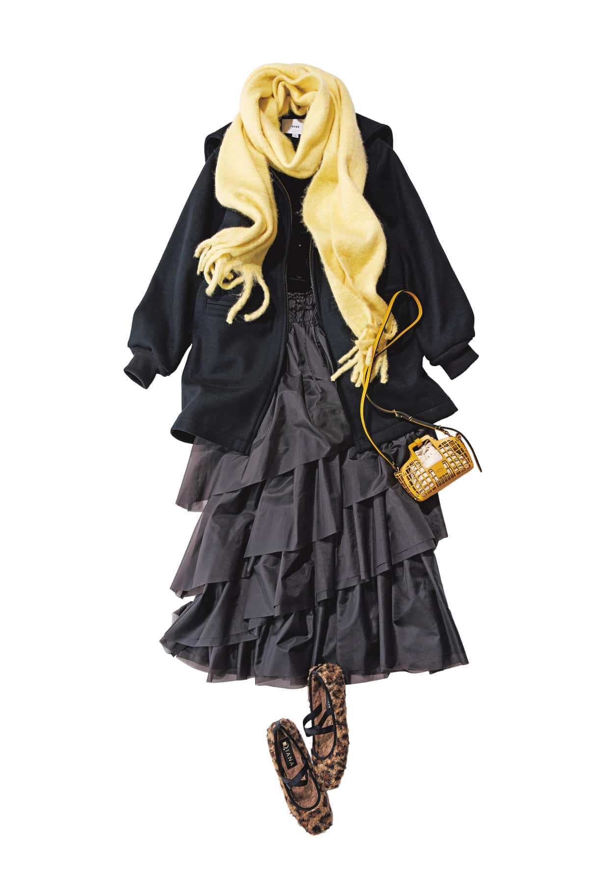 親しみやすいバターイエローのマフラーが、冬の黒コーデにやさしい華やぎをプラス。ドレッシーなスカートともこもこ素材で可愛げを添えつつ、モードな黒アウターと合わせれば大人顔に着地。ティアードスカートで甘さを添えれば今どきバランスに。
