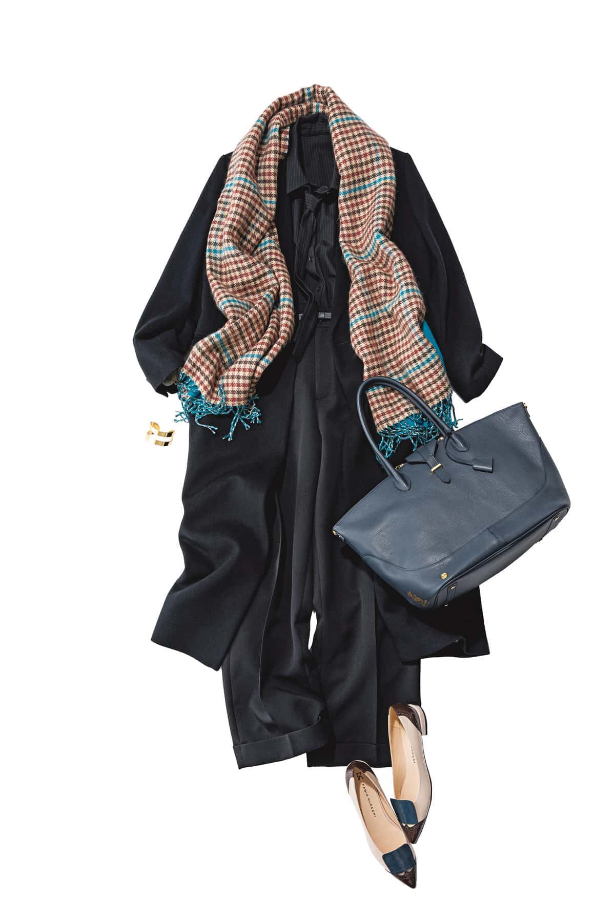 マニッシュな着こなしに、ガンクラブチェックのストールで柔らかなアクセントを。ブルー×ブラウンの配色が、辛口スタイルに程よいカジュアル感を添えてくれます。