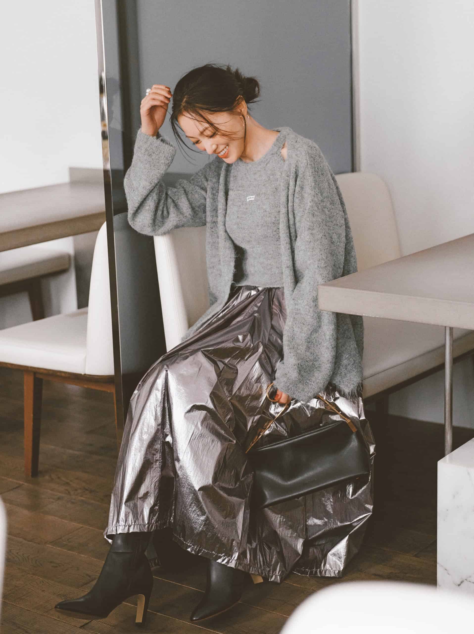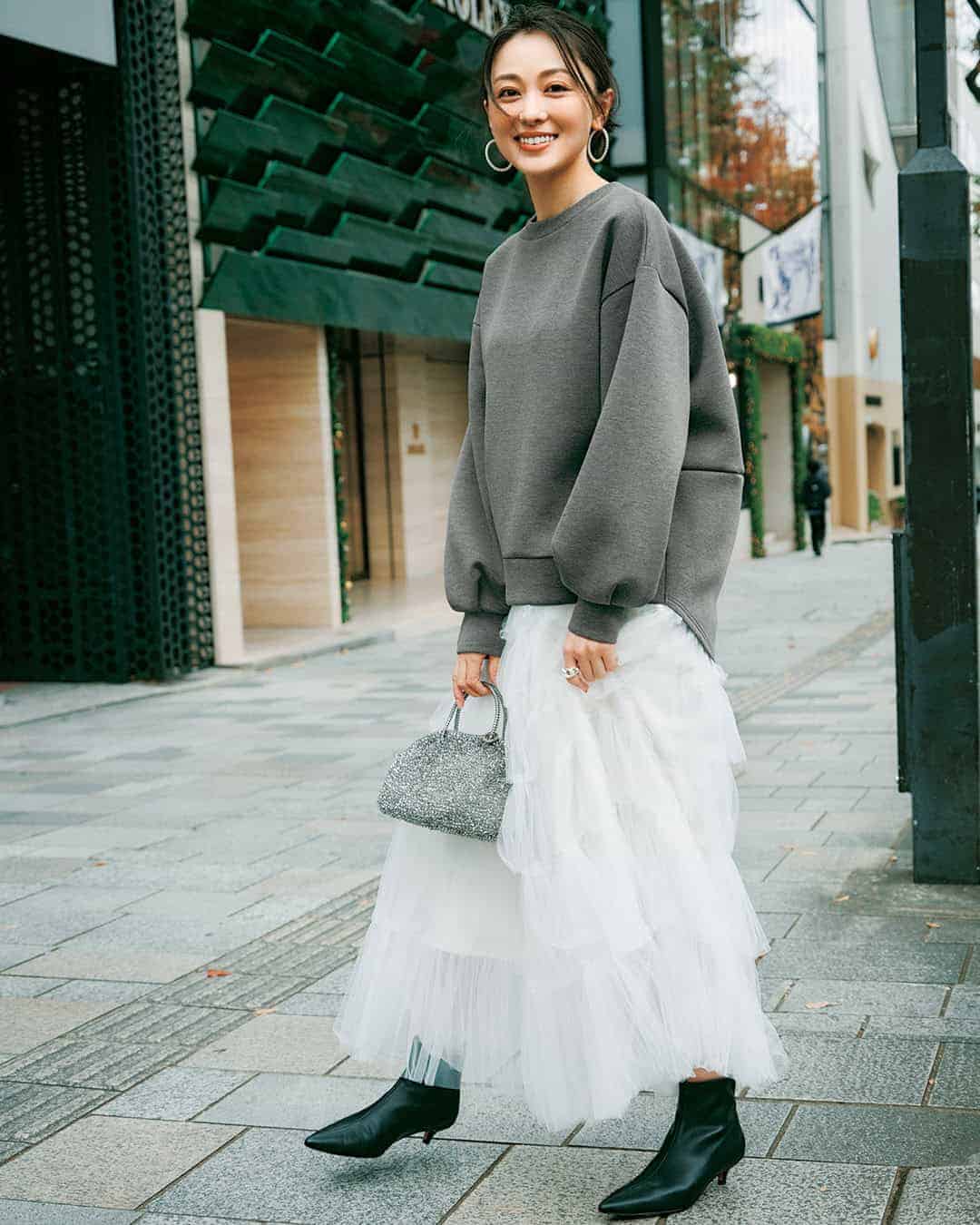 スウェット¥13,200(スパン)スカート¥38,500(HER.)バッグ¥77,000(アンテプリマ/アンテプリマジャパン)ブーツ¥15,950(ル タロン/ル タロン ルミネ有楽町マルイ店)ピアス¥12,100リング¥9,900(ともにワンエーアールバイウノアエレ/ウノアエレ ジャパン)
