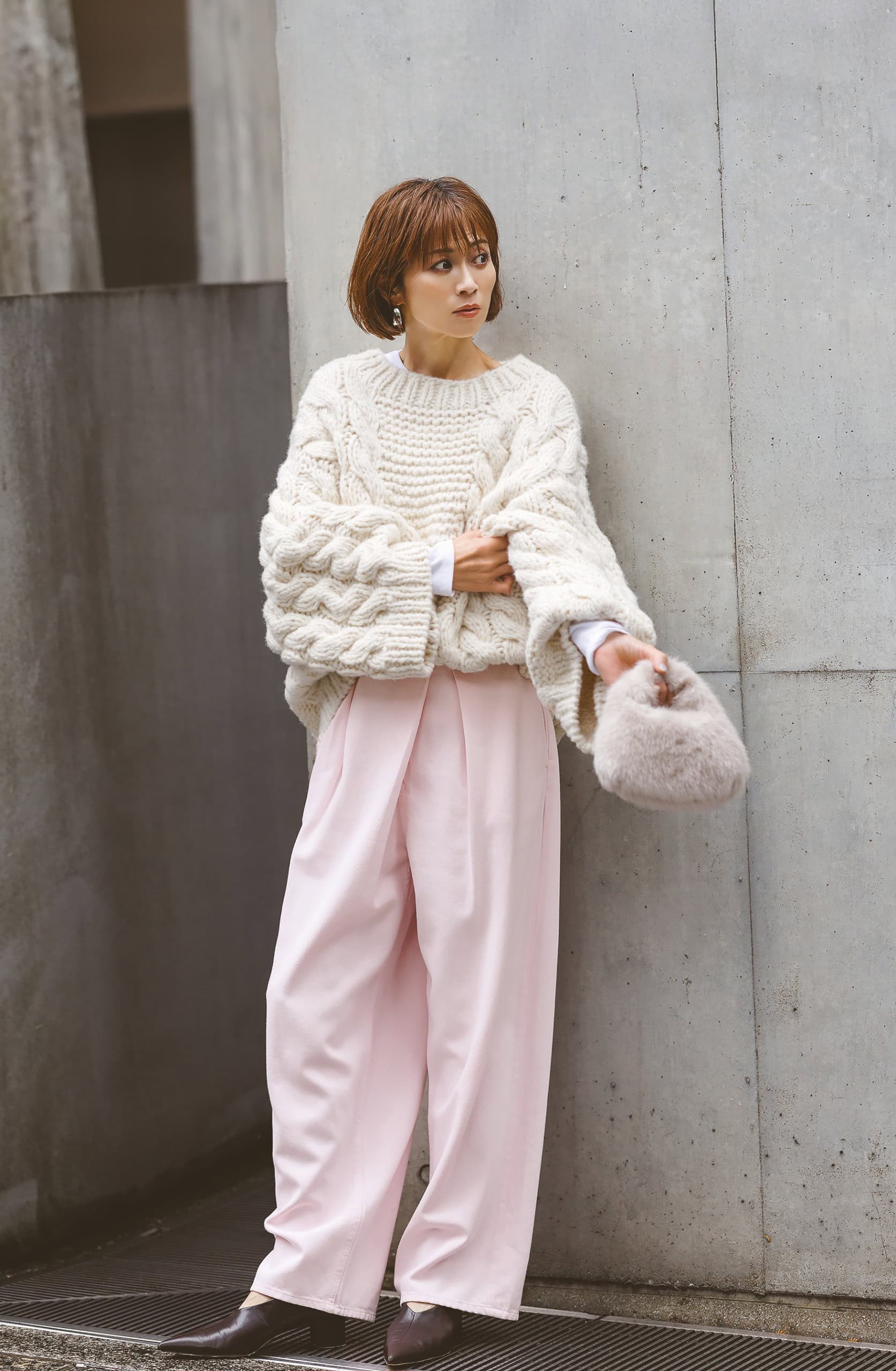 膨張が気になる白ニットも、体のラインを拾わないざっくりサイズなら、華奢見えアイテムにシフト。同じくボトムスもワイドパンツを選びつつ、ウエストの切り替えをすればメリハリよく仕上がります。動きやすさもきちんと感も欲しい、お正月のママシーンに頼れる着合わせです。