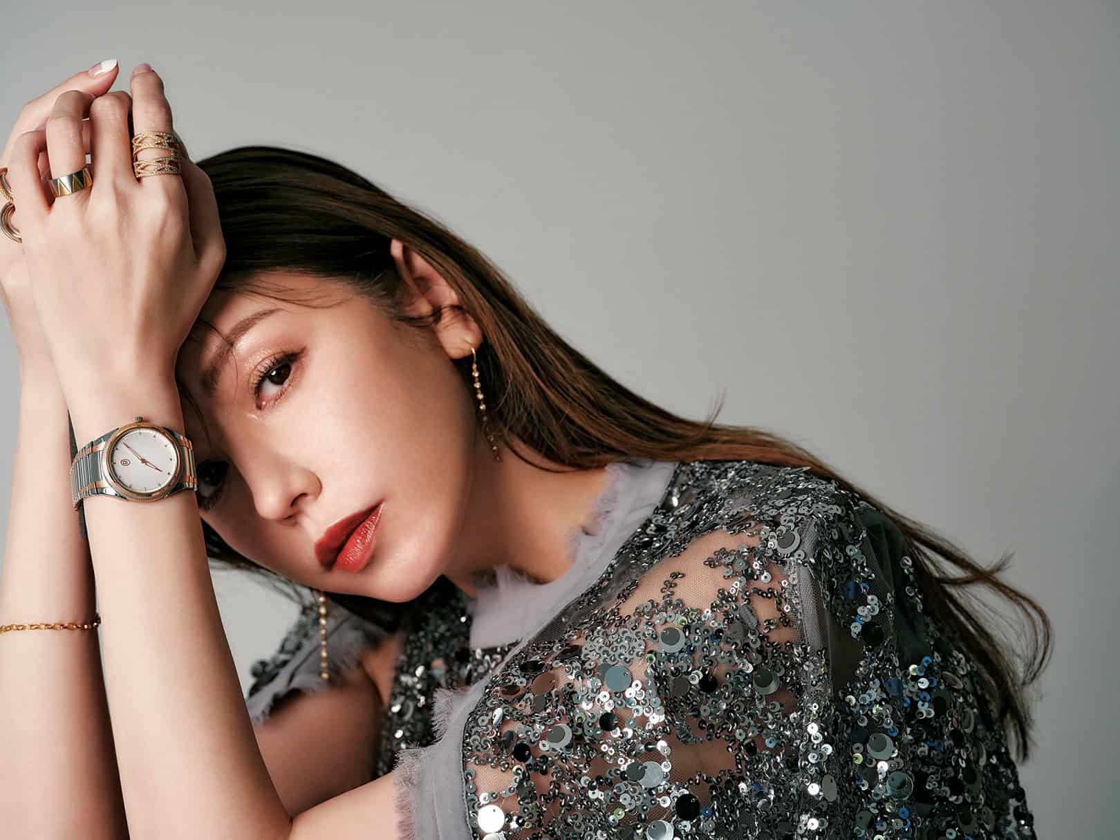 ケース径は華奢な女性の腕にもフィットする36.1㎜サイズ。小さめの径の人気が高まっている傾向のある、メンズとのシェア時計にもちょうどいいサイズ感です。時計左はモデルカットと同じ、時計右は文字盤色のバリエーションでシックなイメージの「サンドグレーカラー」、インデックスには18Kローズゴールドが用いられています。