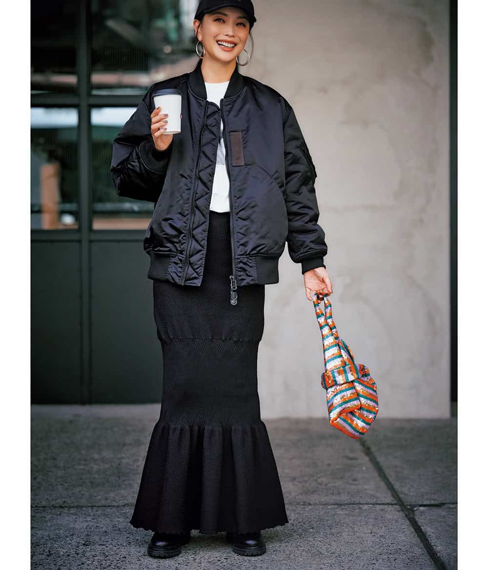 ブルゾン¥88,000(ハイク/ボウルズ)ニットスカート¥79,200(ハルノブムラタ/ザ・ウォール ショールーム)Tシャツ¥12,100(ジム ゴールドバーグ フォー サロン/サロン アダム エ ロぺ)バッグ¥95,700(アシシュ/スーパー エー マーケット 青山)ブーツ¥192,500(セルジオ ロッシ/セルジオ ロッシ ジャパン カスタマーサービス)キャップ¥12,100(ザ ニュー ソサエティ/サードマガジン)ピアス¥71,500(ソフィー ブハイ/エスケーパーズ アナザーワールド)