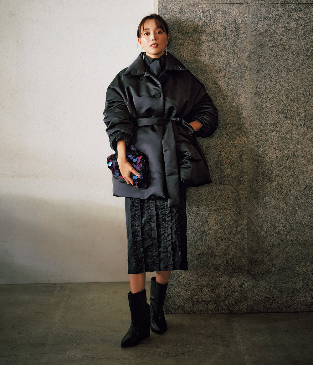 ダウンコート¥132,000(オブリオ)ブラウス¥39,600(エブール/リトルリーグ インク)スカート¥34,100(アルディー ノアール/スピック&スパン ルミネ有楽町店)バッグ¥86,900(マリア ラ ローザ/ロンハーマン)ブーツ¥89,100(パープレッド)ピアス¥143,000(ソフィー ブハイ/エスケーパーズ アナザーワールド)
