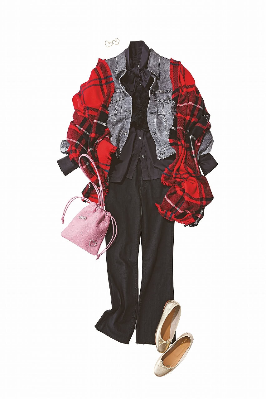 デニムONデニムに、ボウタイブラウスでほんのりフェミニンさをプラス。赤のチェックマフラーを効かせてトラッド感のある華やぎを演出。重くなりがちな上下デニムも、甘インナーと赤のアクセントで一気に軽やかに整います。