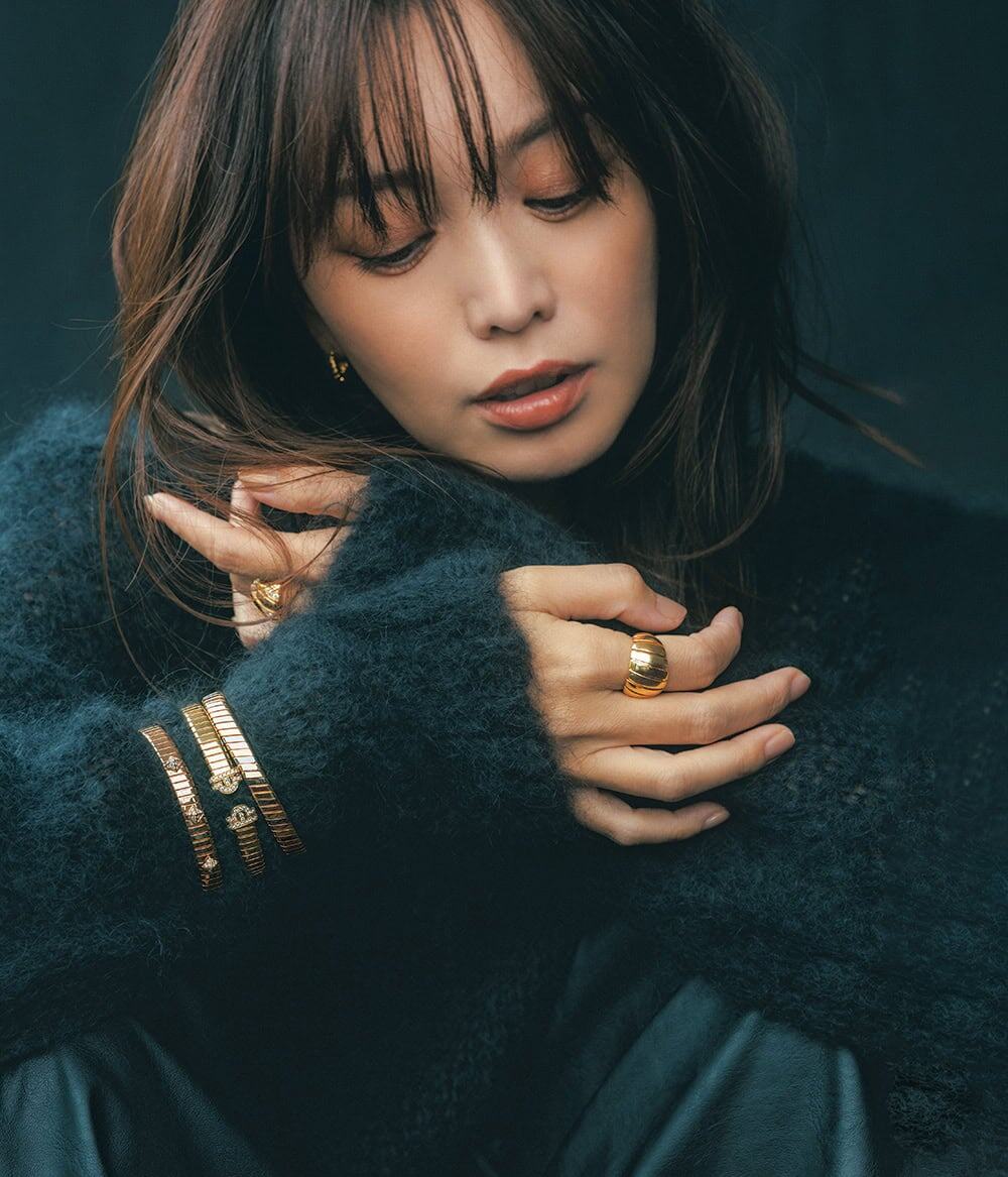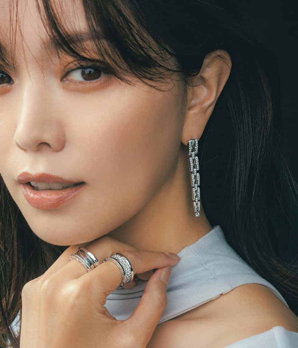 さまざまなジュエリーを身につけてきた蛯原さんが、結婚指輪に選んだのはブシュロン。「夫婦で同じデザインを。と、結婚指輪はブシュロンを選びました。ジェンダーレス、ボーダーレス、タイムレス……。既成概念を飛び越える力強いデザインにエネルギーをもらえます」(モデル・蛯原さん)