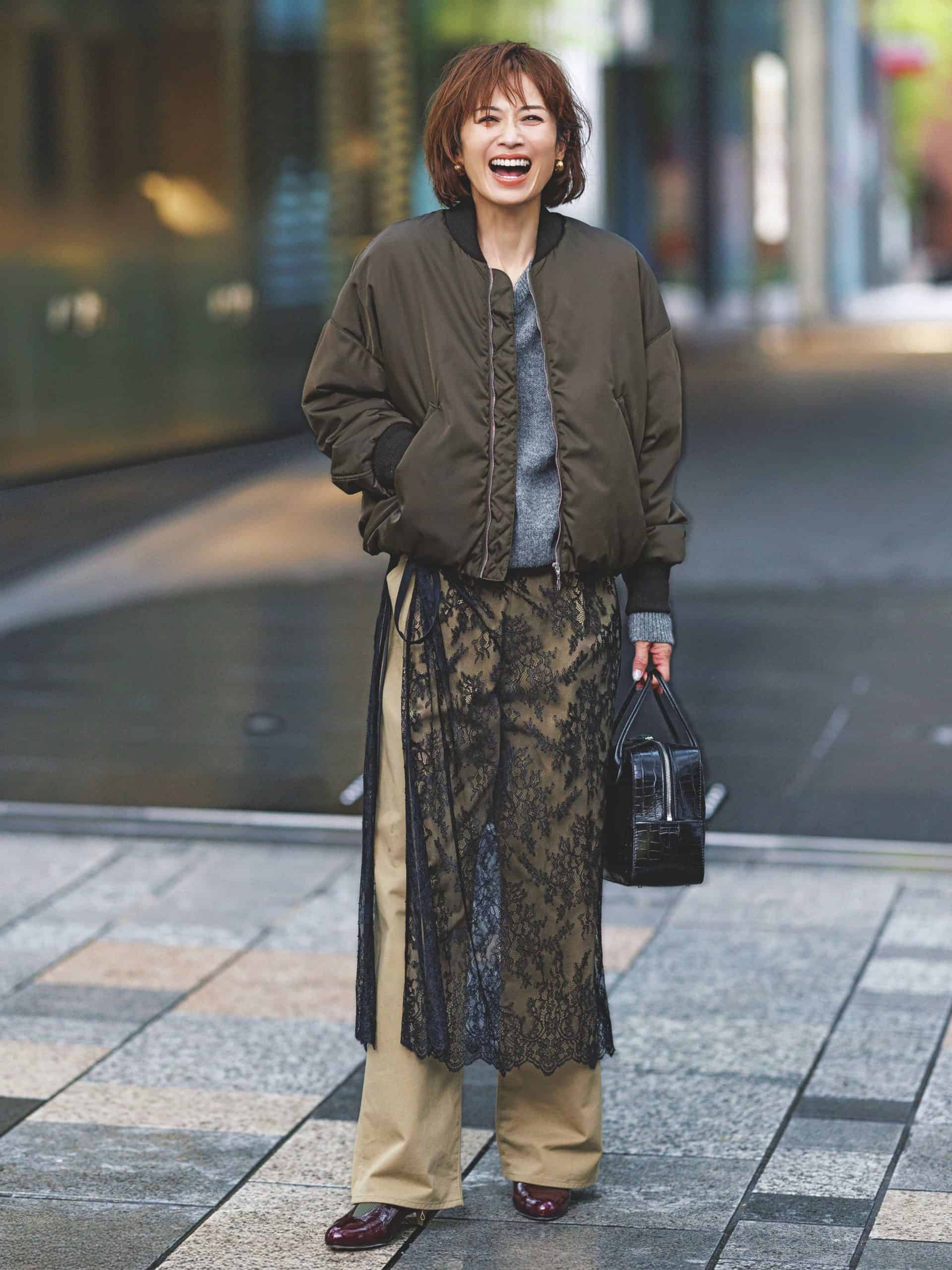 レーススカート¥35,200(カオス/カオス丸の内)中に着たパンツ¥31,900(KURO/サードマガジン)アウター¥49,500(ティッカ)中に着たニット¥35,200(オブリオ)ピアス¥13,200(IRIS 47/フーブス)バッグ¥93,500(メゾン カナウ/ヤマニ)パンプス¥24,200(オデット エ オディール/オデット エ オディール 新宿店)靴下¥1,100(タビオ/Tabio)